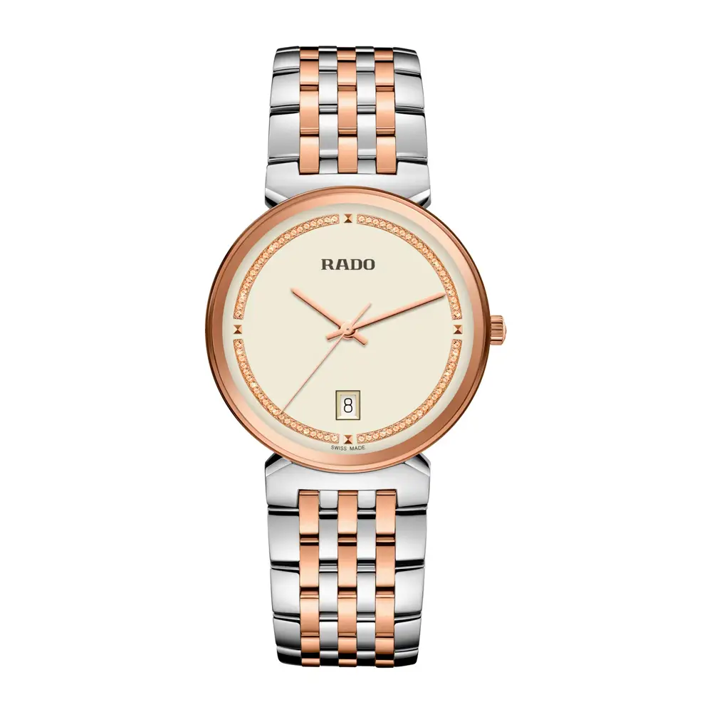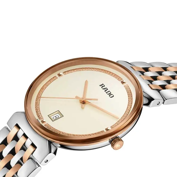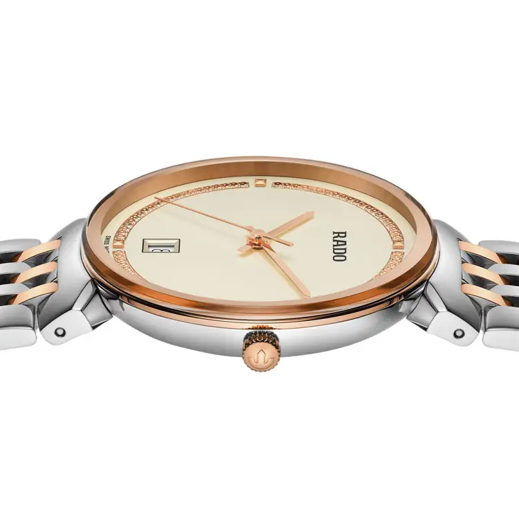 Rado Florence R48912403 v sobě spojuje klasickou eleganci a moderní zpracování typické pro značku Rado. Tento model se vyznačuje kulatým pouzdrem o průměru 38 mm, které je vyrobeno z oceli a doplněno o lunetu s růžovým zlacením, jež dodává hodinkám jemný a sofistikovaný kontrast.