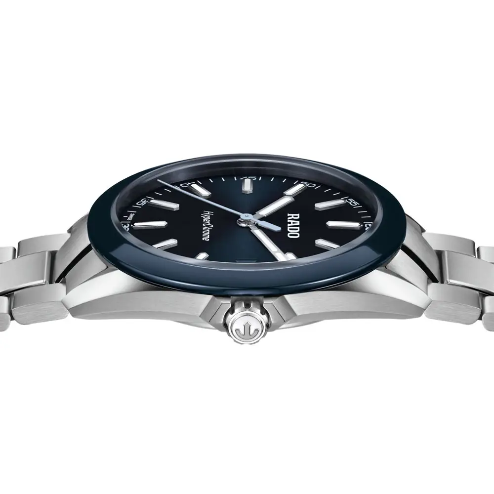 Rado HyperChrome 41,5 mm zaujme sportovní elegancí, robustností a čistým designem. Pouzdro z nerezové oceli je doplněno o pevnou lunetu z high-tech keramiky, která zajišťuje výjimečnou odolnost vůči poškrábání. Ciferník v odstínu tmavě modrého sunray efektu doplňují ručky a indexy s luminiscencí Super-LumiNova®, přičemž vteřinová ručka svítí zeleně a ostatní prvky modře. Hodinky chrání safírové sklíčko s antireflexní vrstvou a jsou vodotěsné do 150 metrů.