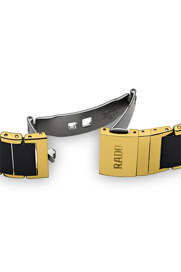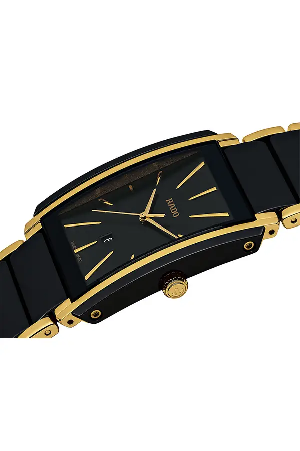 Integral R20204162 představuje ikonický model, který v sobě spojuje moderní minimalismus a luxusní detaily. Obdélníkové pouzdro o rozměrech 31 × 41 mm, vyrobené z kombinace keramiky, oceli a žlutého zlacení, je chráněno odolným safírovým sklíčkem, které zajišťuje dlouhotrvající lesk bez škrábanců. Elegantní černý ciferník je doplněn praktickou datumovkou na třetí hodině, což podtrhuje funkčnost modelu.