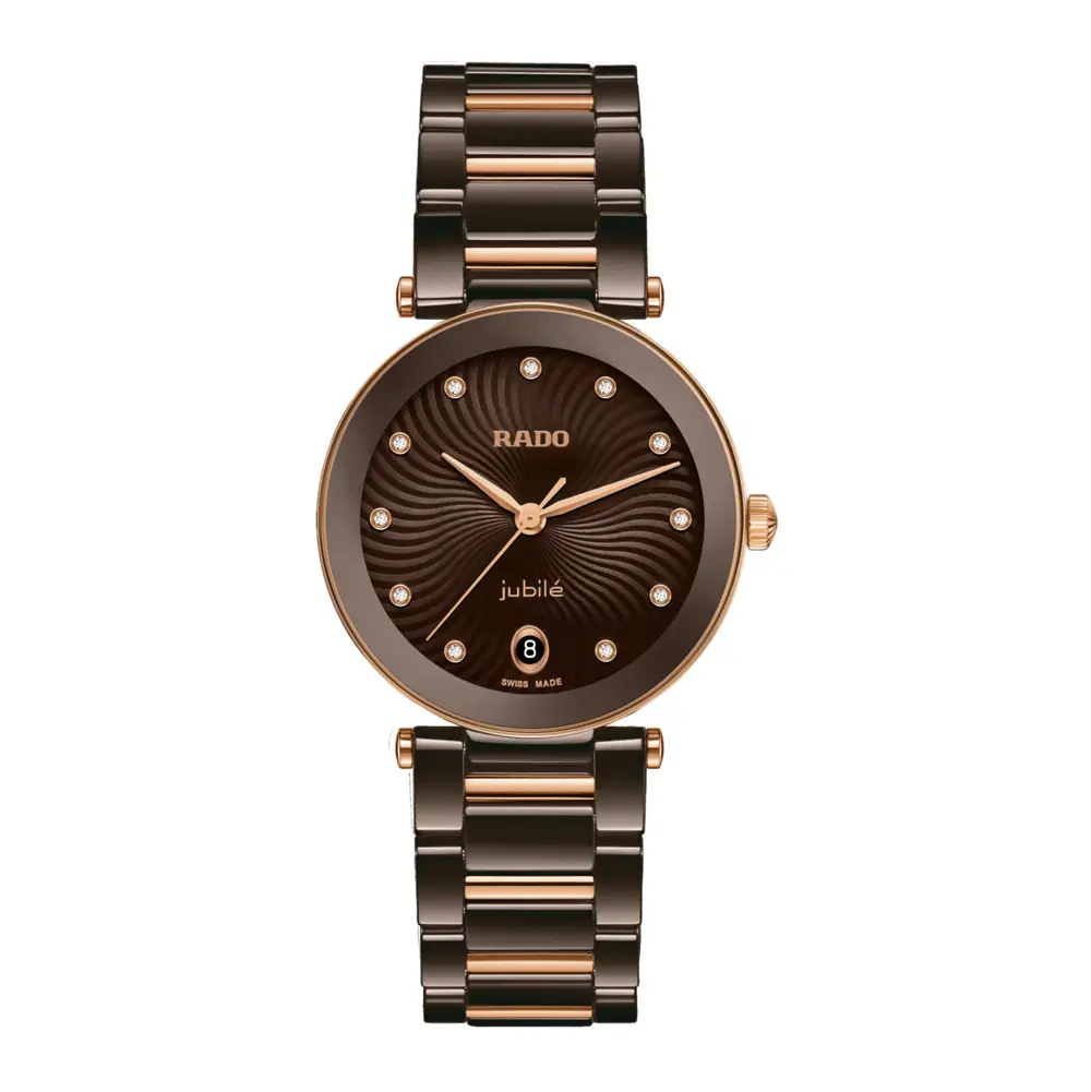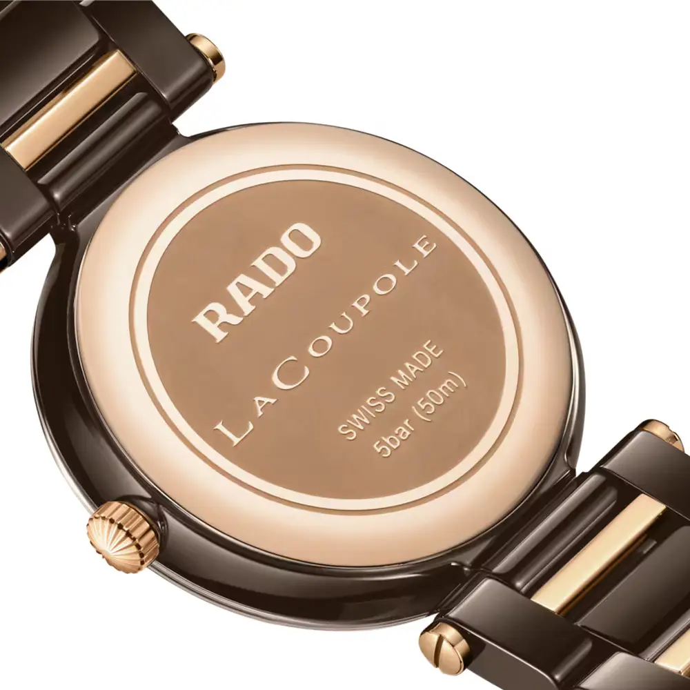 Dámské hodinky Rado La Coupole Diamonds R22242703 představují spojení švýcarské preciznosti, technické inovace a jemného luxusu. Jejich 31mm pouzdro z leštěné hnědé high-tech keramiky doplňuje luneta z oceli s PVD úpravou v odstínu růžového zlata, která dodává modelu teplý, elegantní charakter a podtrhuje ženský styl.