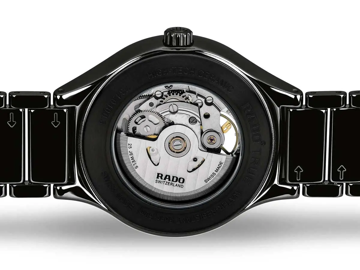 Uvnitř tiká automatický kalibr Rado R734, s rezervou chodu až 80 hodin a možností ručního nátažení. Strojek je vybaven antimagnetickou pružinou Nivachron™, která zajišťuje přesnost i v náročných podmínkách. Hodinky mají vodotěsnost 5 ATM (50 m) – ideální pro běžné nošení.