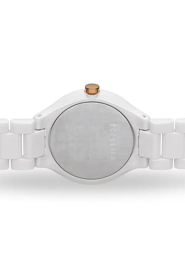 Rado True Thinline R27958722 je dokonalým ztělesněním minimalistické elegance a švýcarské preciznosti. Její 30mm pouzdro z bílé high-tech keramiky zaujme mimořádně tenkým profilem pouhých 4,9 mm, díky čemuž hodinky působí lehce, jemně a dokonale padnou na dámské zápěstí.