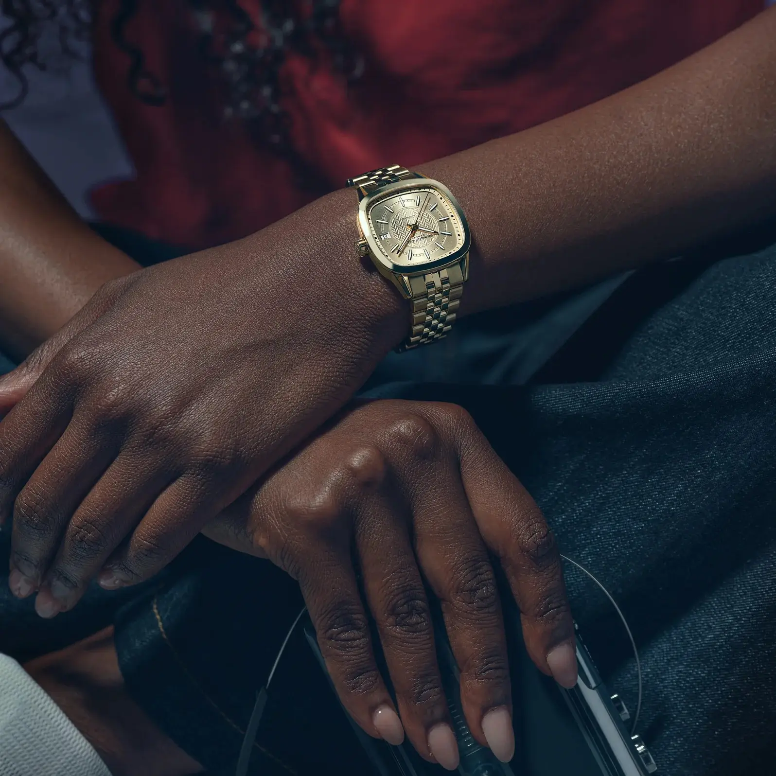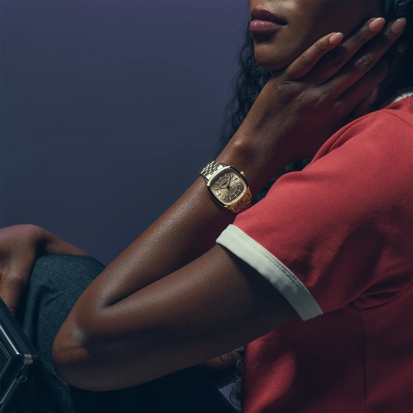 Ocelový tah se žlutě zlacenými články a skládací spona s dvojitým stiskem dokončují celkový design. Díky tloušťce pouhých 9,3 mm působí hodinky na ruce elegantně a pohodlně – ideální volba pro každodenní styl i speciální příležitosti.