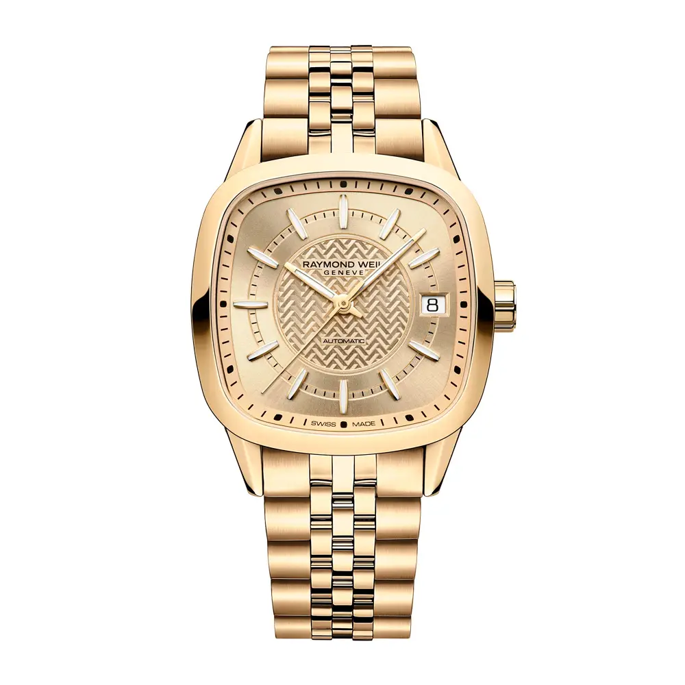 Raymond Weil Freelancer 2490-P-10051 je elegantní model, který spojuje tradiční švýcarské řemeslo s moderním stylem. Pouzdro 34×34 mm ve tvaru cushion je vyrobeno z oceli se žlutým PVD povlakem a doplněno o champagne ciferník s jemným motivem W guilloché. Ručky a indexy se Super-Luminova® zajišťují čitelnost i ve tmě.