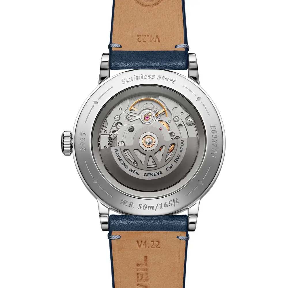 Srdcem hodinek je automatický kalibr RW4200 s rezervou chodu 41 hodin, který lze pozorovat přes průhledné safírové dýnko. Model doplňuje modrý kožený řemínek s kontrastním prošíváním a nabízí vodotěsnost do 50 metrů. Raymond Weil Millesime 2925-STC-50001 jsou ideální volbou pro muže, kteří ocení nadčasový design inspirovaný tradicí a spolehlivou švýcarskou mechaniku.