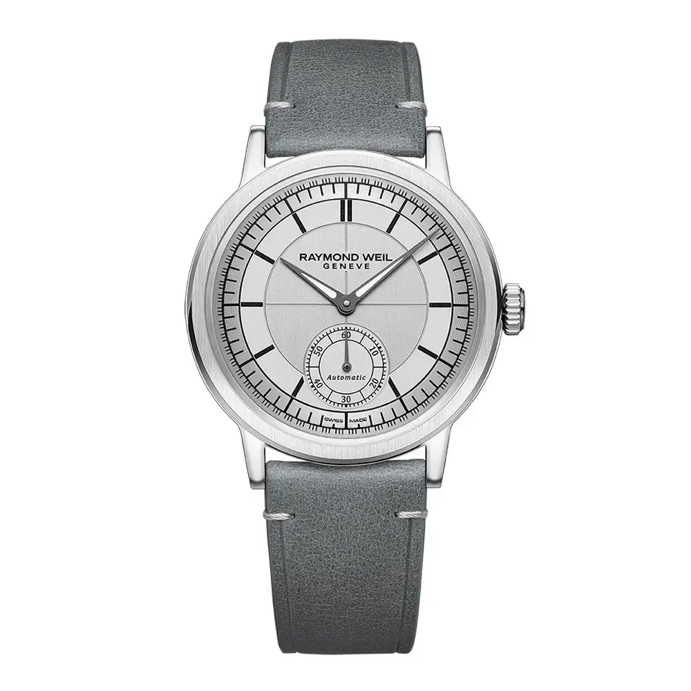 Raymond Weil Millesime 2930‑STC‑65001 představuje elegantní spojení mezi vintage estetikou a precizní švýcarskou hodinářskou technologií. Jeho klasické pouzdro o průměru 39,5 mm z leštěné nerezové oceli je osazeno vypouklým safírovým sklíčkem s antireflexní vrstvou, které chrání stříbrný sektorový číselník s jemně broušenými strukturami a malou sekundovou ručkou na pozici 6 hodin. Jemné zpracování povrchu, matné a lesklé detaily, vytváří efektní kontrast a přehledný vizuální dojem.