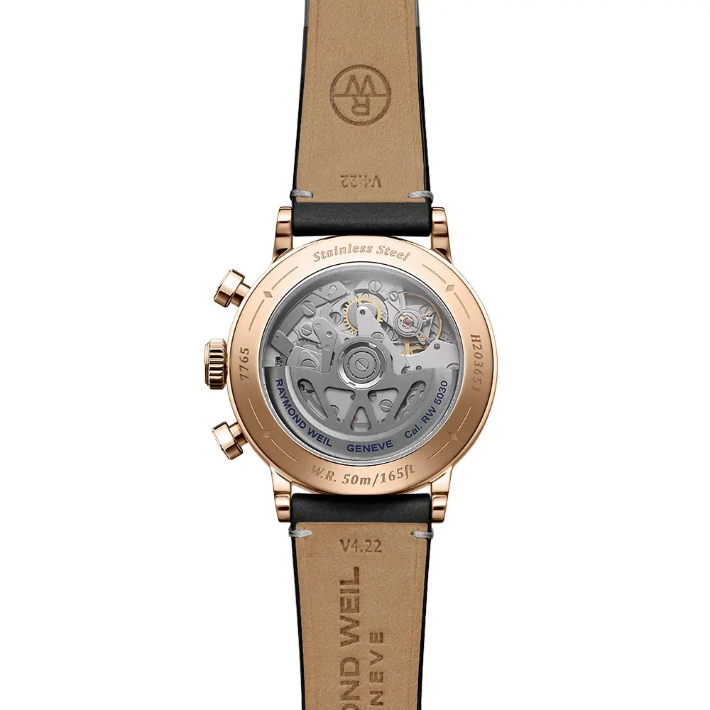 Model Raymond Weil Millesime Chronograph 7765-PC5-20631 je elegantní poctou designu 70. let, zasazenou do moderního švýcarského zpracování. Zaujme kontrastním reverse panda číselníkem, 39mm pouzdrem s růžově zlatou PVD úpravou a výraznými luminiscenčními ručkami. Detaily jako bombírované safírové sklíčko či jemná tachymetrická stupnice zdůrazňují vintage charakter v kombinaci s precizním provedením.