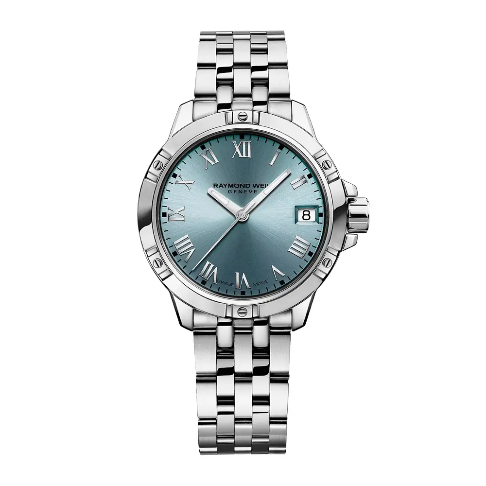 Raymond Weil Tango 5960-ST-00500 jsou dámské hodinky, které dokonale propojují eleganci, funkčnost a švýcarskou preciznost. Pouzdro o průměru 30 mm je vyrobeno z nerezové oceli a doplněno safírovým sklíčkem odolným proti poškrábání. Světle modrý číselník se slunečním efektem zdobí římské číslice, luminiscenční ručky a datumové okénko na pozici 3. hodiny, které podtrhuje jejich praktický charakter.