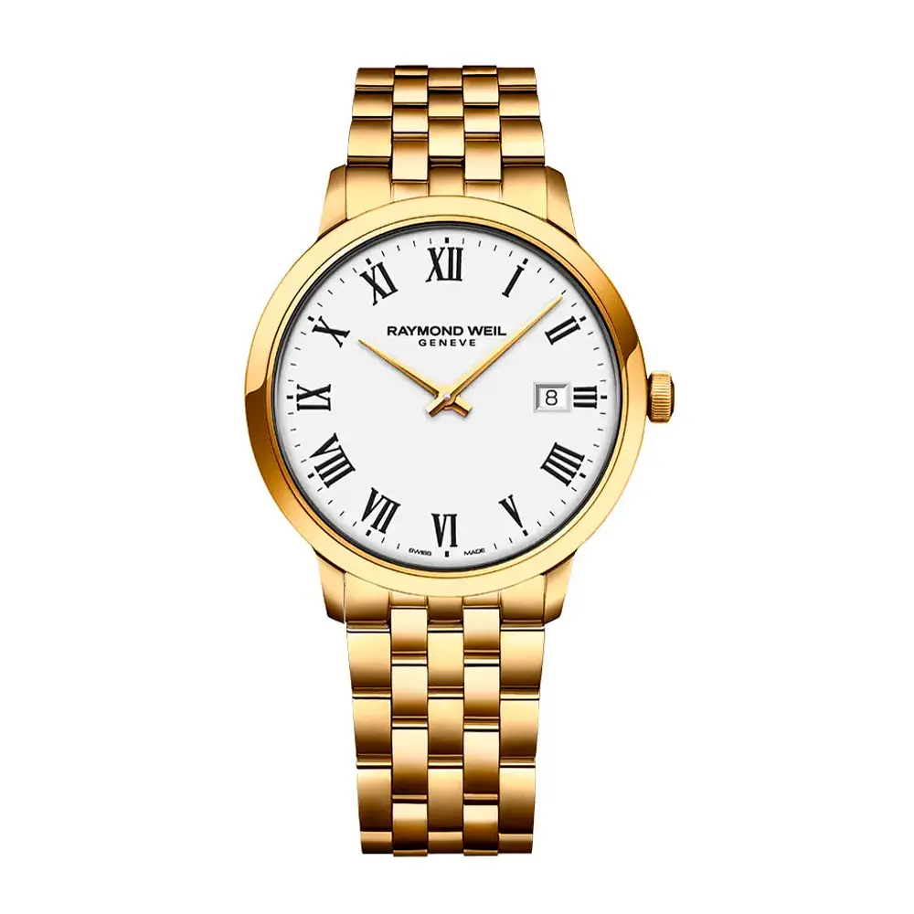 Raymond Weil Toccata 5485-P-00300 jsou elegantní pánské hodinky, které kombinují nadčasový design s moderními prvky. Hodinky jsou vybaveny quartzovým strojkem, který zajišťuje přesnost a spolehlivost. Mají 39mm pouzdro pokryté žlutým zlatým PVD, což jim dodává luxusní vzhled. Ciferník je bílý s černými římskými číslicemi a datumovkou na třetí hodině, což přidává na klasickém stylu a snadné čitelnosti.