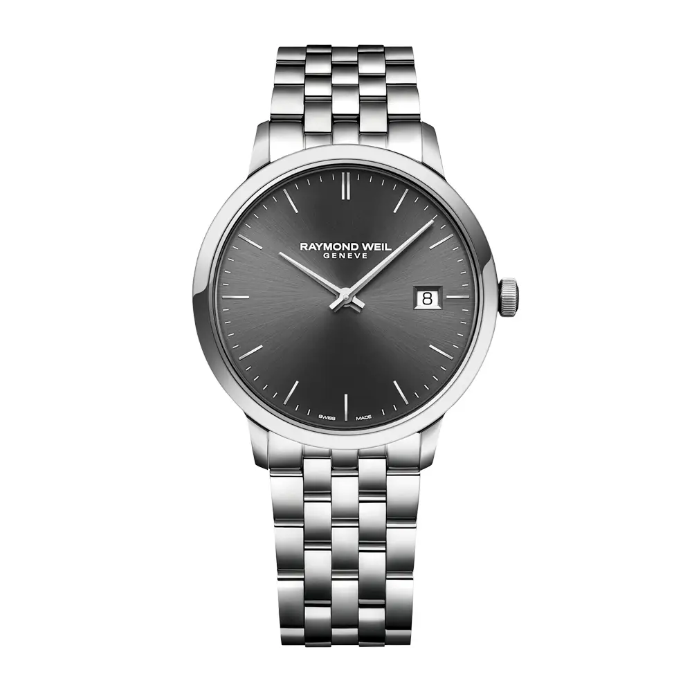 Raymond Weil Toccata 5588-ST-60001 představují pánské hodinky, které spojují klasickou eleganci, moderní minimalismus a švýcarskou preciznost. Pouzdro o průměru 42 mm je vyrobeno z leštěné nerezové oceli a chráněno safírovým sklíčkem odolným proti poškrábání. Šedý číselník se slunečním efektem doplňují stříbrné indexy a ručky, zatímco datumové okénko na pozici 3. hodiny podtrhuje čistotu a funkčnost designu.