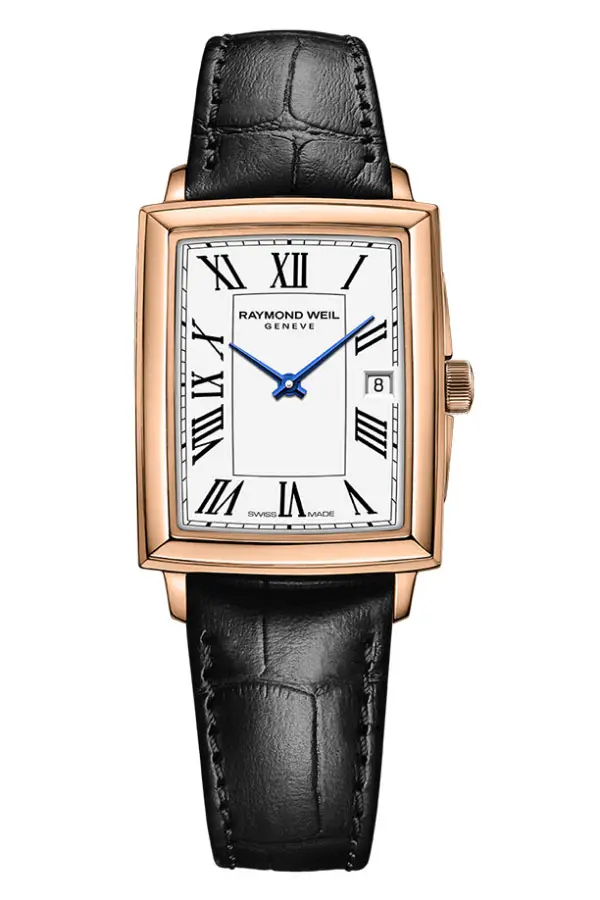 Raymond Weil Toccata 5925-PC5-00300 jsou elegantní dámské hodinky, které v sobě spojují klasický design s moderními prvky, což je ideální pro každodenní nošení i slavnostní příležitosti. Tyto hodinky mají obdélníkové pouzdro z nerezové oceli s PVD povlakem v růžovém zlatě o rozměrech 22,6 x 28,1 mm, což jim dodává sofistikovaný vzhled. Bílý číselník je osazen černými římskými číslicemi, které jsou nejen estetické, ale i dobře čitelné.