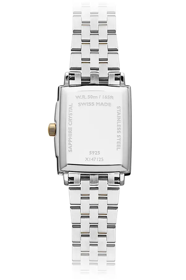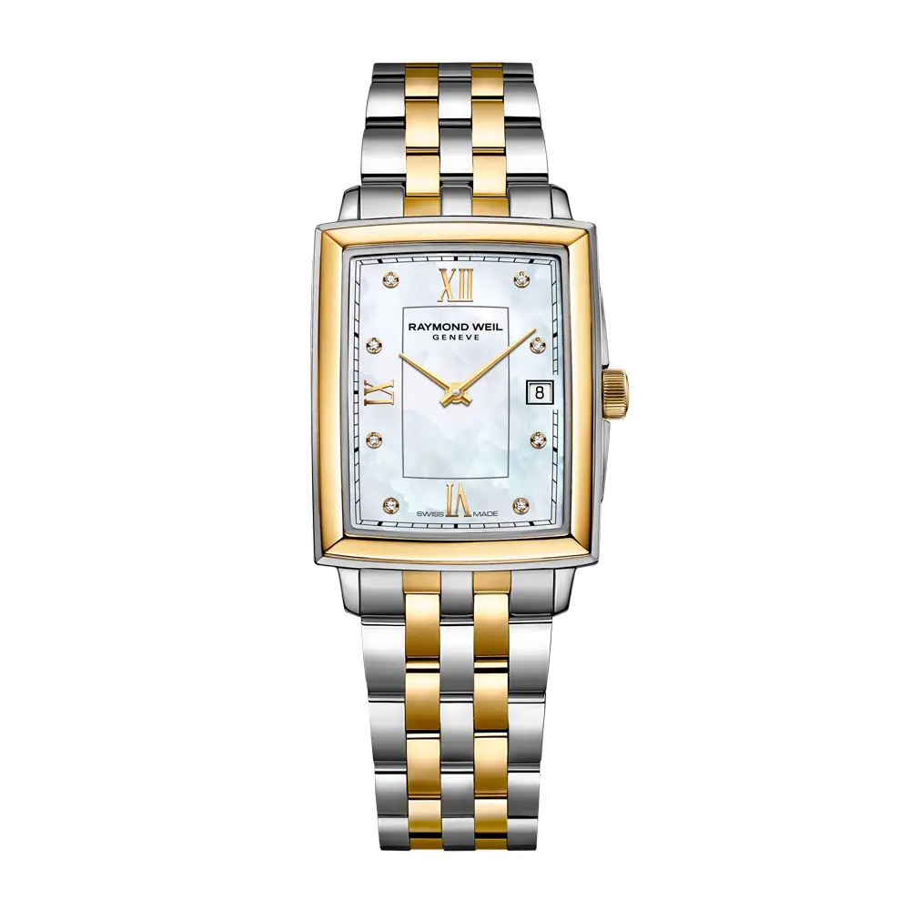 Raymond Weil Toccata 5925-STP-00995 jsou dámské hodinky, které v sobě spojují jemnost art-deco stylu, eleganci a švýcarskou preciznost. Obdélníkové pouzdro o rozměrech 22,6 × 28,1 mm je vyrobeno z nerezové oceli se zlatou PVD úpravou a chráněno safírovým sklíčkem odolným proti poškrábání. Perleťový číselník zdobí 8 diamantových indexů a římské číslice, které podtrhují ženský a vytříbený charakter modelu.