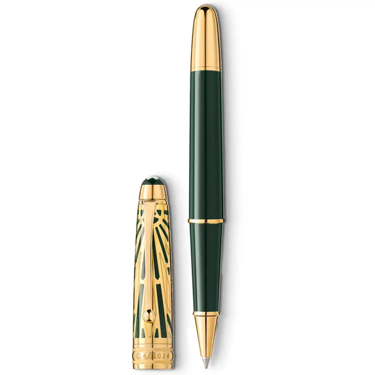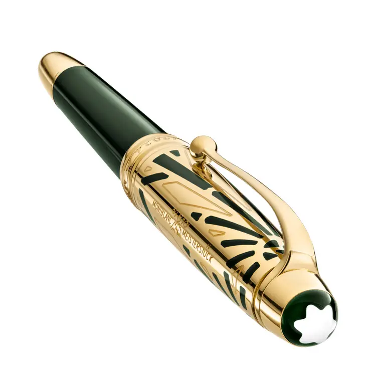 Tělo pera je vyrobeno z vzácné zelené pryskyřice, zatímco víčko potažené zlatem je zdobeno archivním vzorem v zeleném laku, který odkazuje na původní designy Meisterstück. Klip potažený zlatem dodává celku harmonii a vyvážený kontrast.