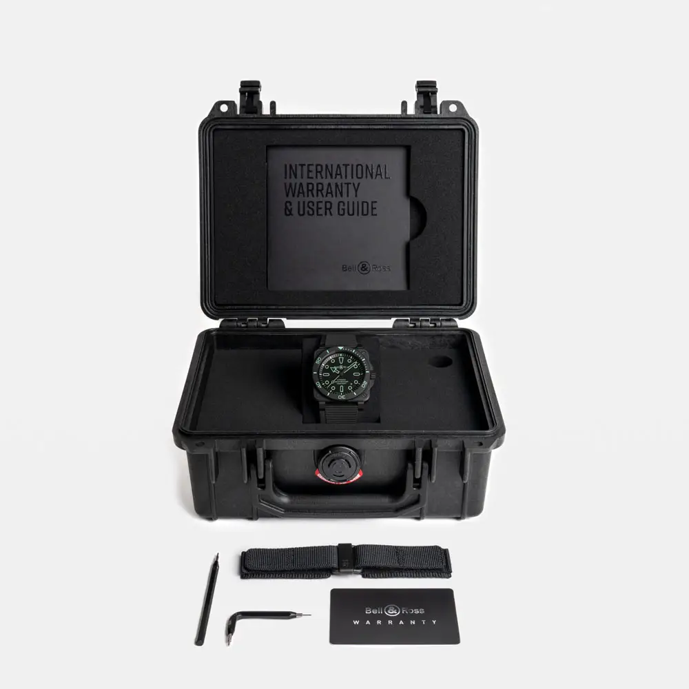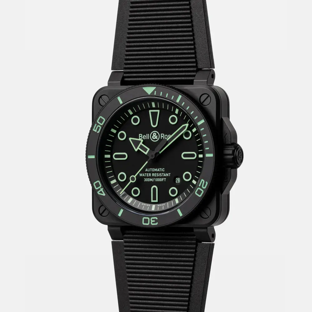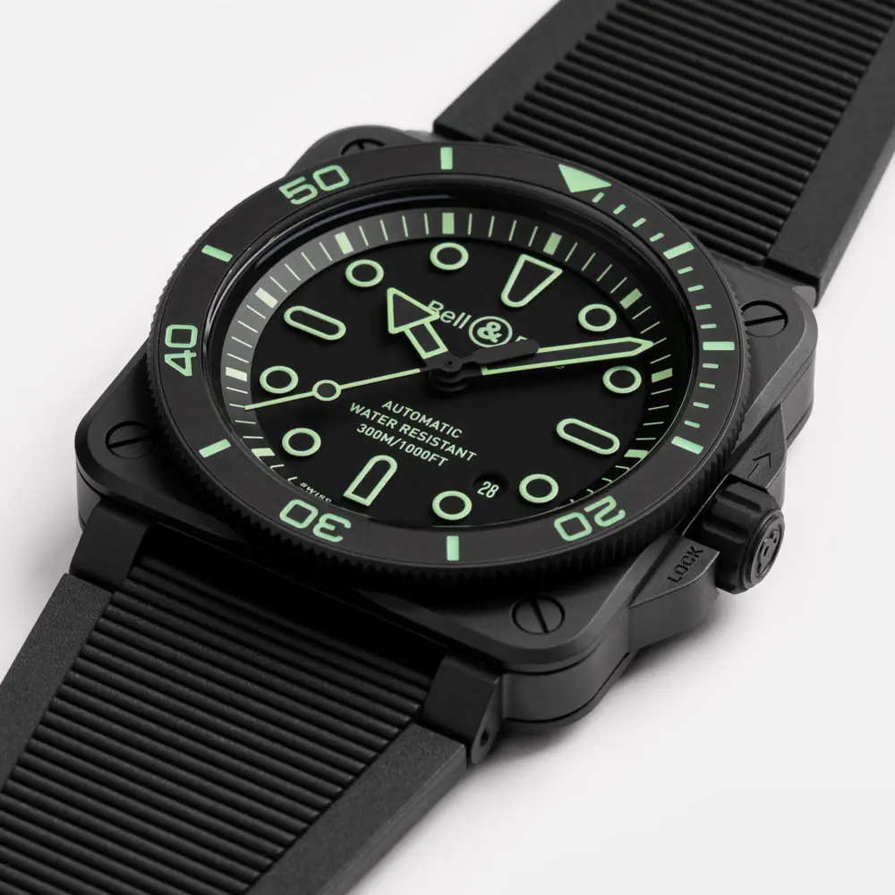 Модель BR 03-92 Diver LUM Outline из коллекции Bell & Ross BR 03 сочетает в себе профессиональные дайверские функции и минималистичный, почти монохроматический внешний вид. Прочный керамический корпус диаметром 42 мм обеспечивает высокую устойчивость к царапинам и коррозии, а его матовое покрытие уменьшает блики и подчеркивает техническую выразительность часов.