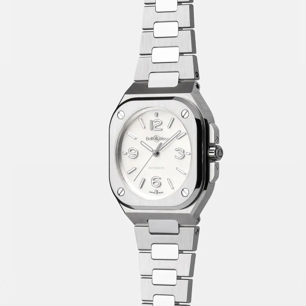 Часы Bell & Ross BR 05 & Ross BR 05 36mm Mother of Pearl Steel (BR05A-S-MP-ST/SST) - это слияние технического дизайна и женской элегантности. Компактный 36-миллиметровый корпус из полированной и матовой нержавеющей стали сохраняет верность культовому стилю BR 05: интегрированный браслет и квадратная форма с закругленными углами вдохновляют на создание авиационных приборов.