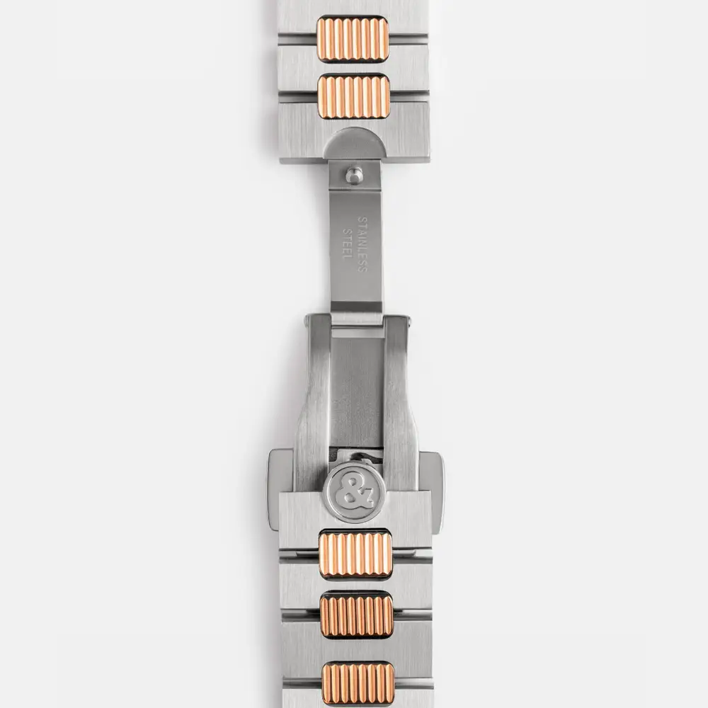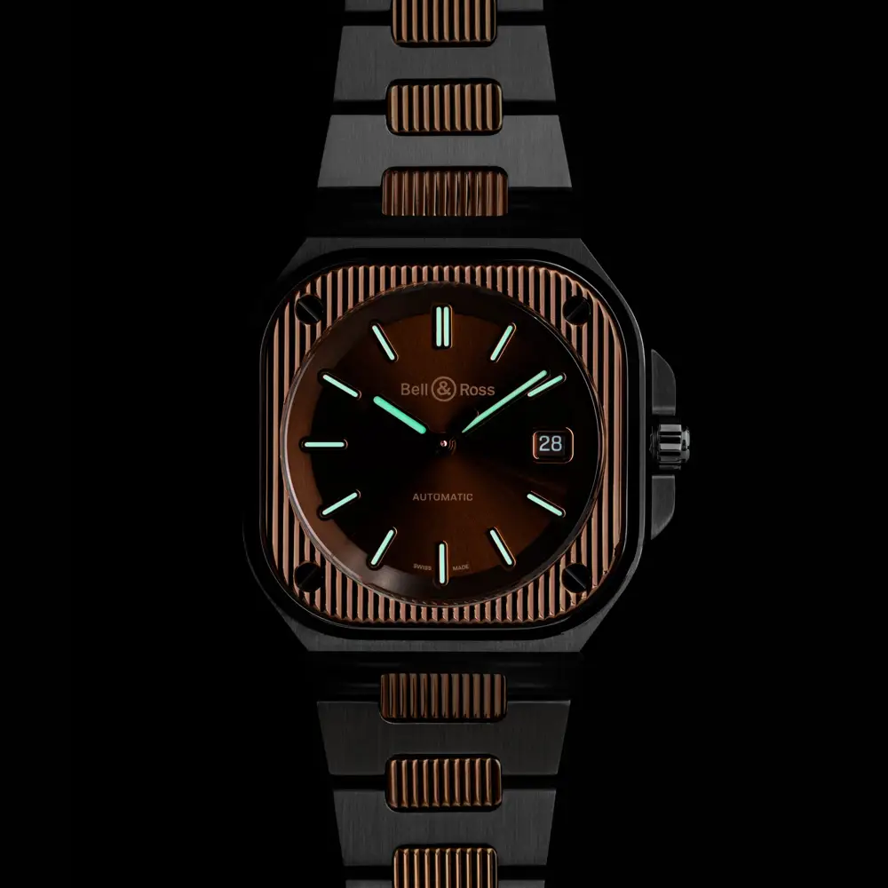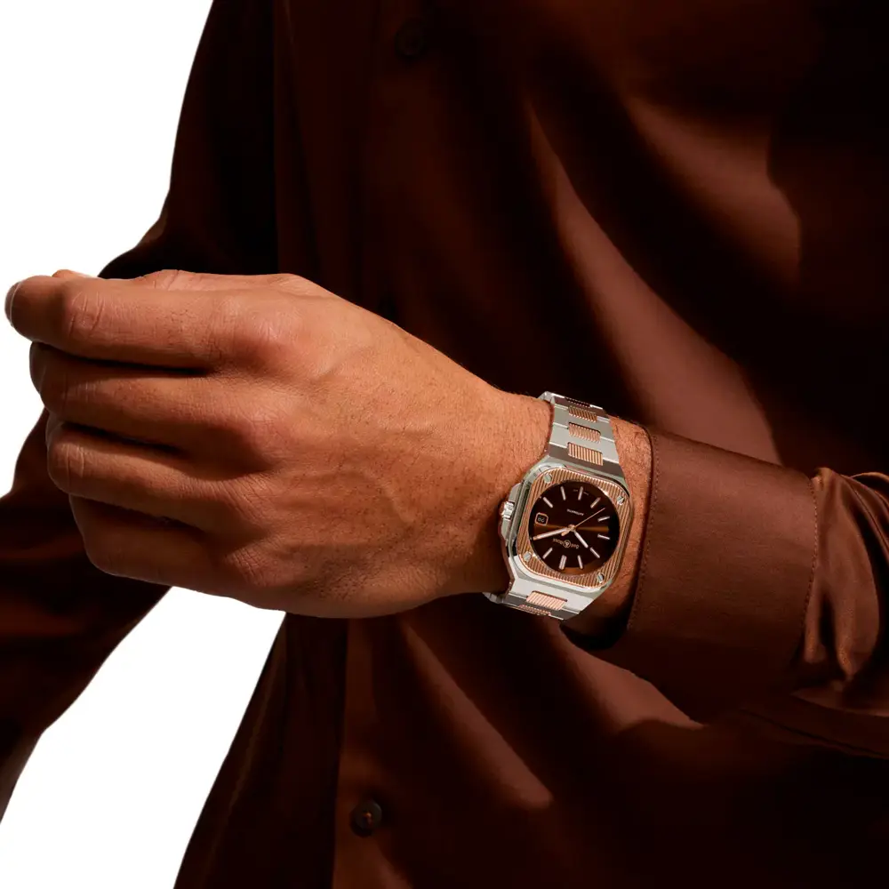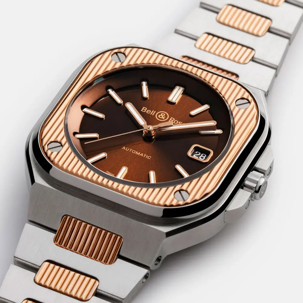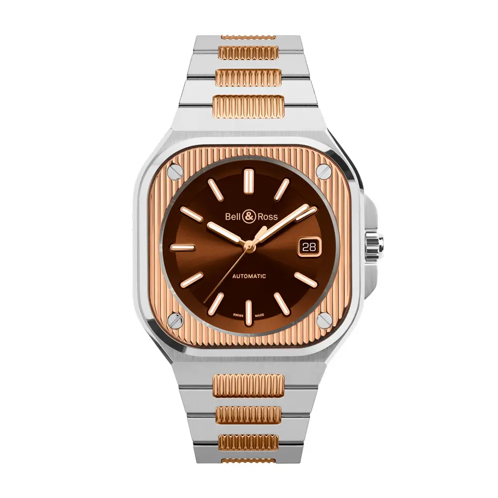 Bell & Ross BR05A-EL-GLST/SSG – Artline Steel & Gold представляет собой идеальное сочетание роскошного двухцветного дизайна и городской элегантности. Корпус 40 × 40 мм выполнен из нержавеющей стали и 18-каратного розового золота, дополнен изысканным коричневым циферблатом Sunray с накладными метками и скелетонизированными стрелками. Сапфировое стекло с антибликовым покрытием и прозрачная задняя крышка подчеркивают утончённость.