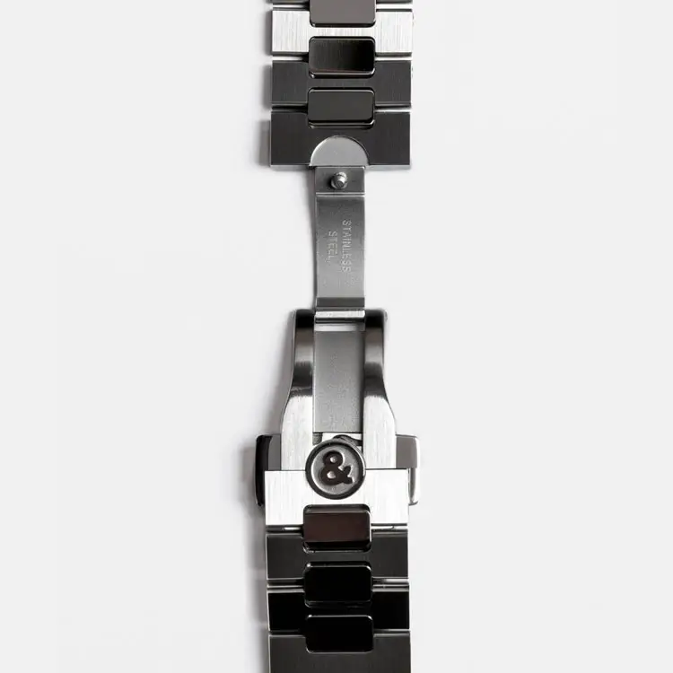 Корпус 41 мм из нержавеющей стали отличается прочностью и изысканной отделкой. Сапфировое стекло с антибликовым покрытием защищает чёрный циферблат с люминесцентными стрелками и метками, обеспечивая отличную читаемость. Дата между 3 и 4 часами сохраняет чистый вид.