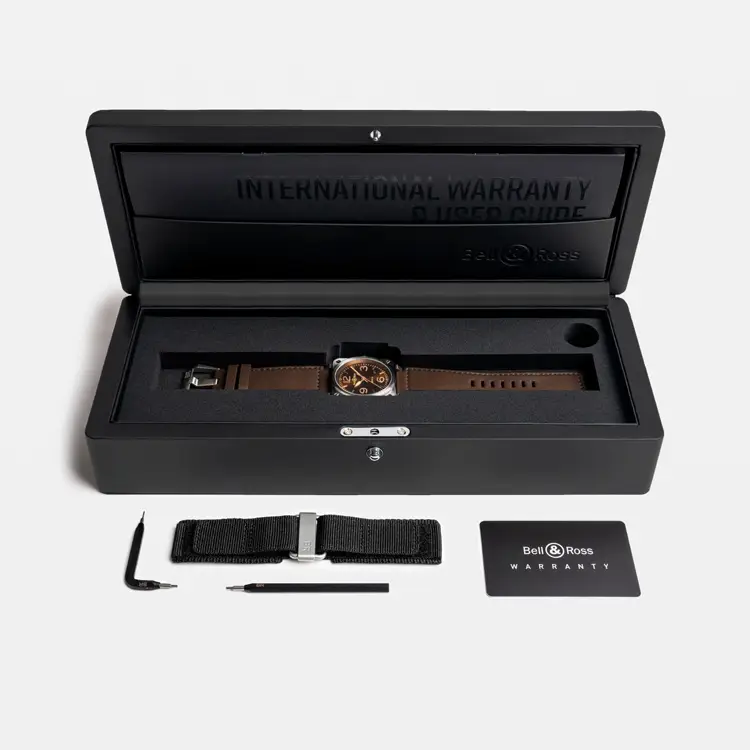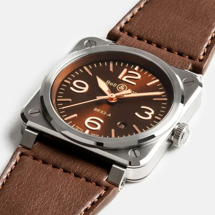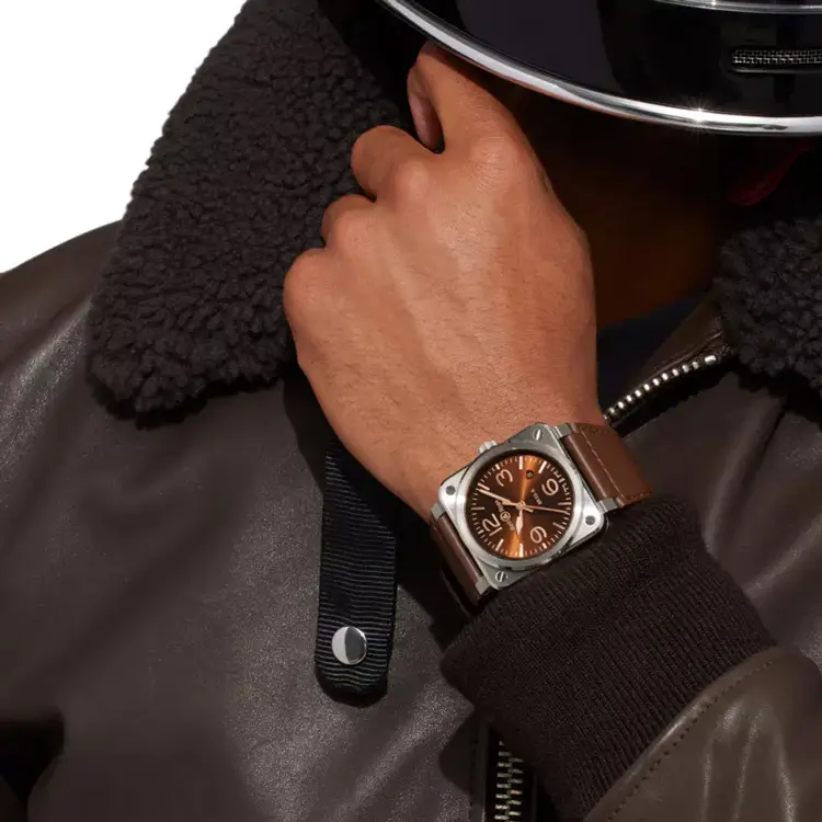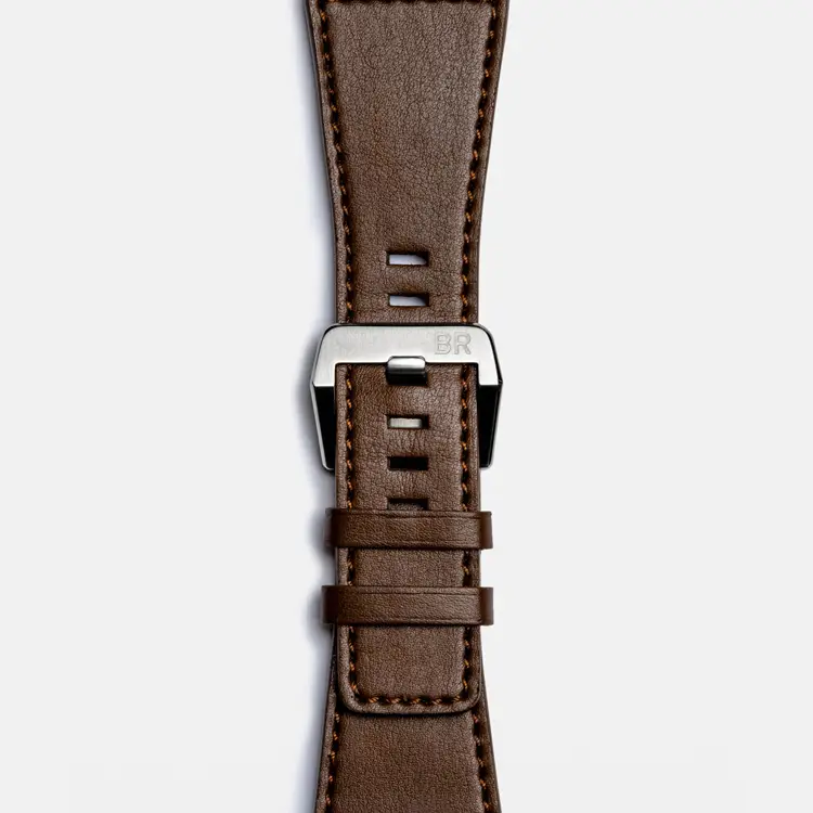 Квадратный корпус из нержавеющей стали 41 мм придаёт часам узнаваемый облик Bell & Ross. Сапфировое стекло с антибликовым покрытием защищает аналоговый коричневый циферблат, на котором золотистые стрелки и метки с люминесцентным покрытием хорошо видны даже в темноте.