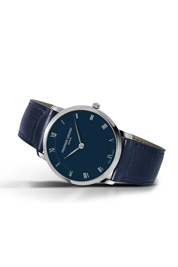 В модельном ряду Frederique Constant Slimline мастерская работа с контрастами и стильный чистый дизайн непременно привлекают внимание. Эти мужские часы уверенно держатся на темно-синей элегантной основе, в которой цвет кожаного ремешка переплетается с плоским циферблатом. Серебро стального корпуса привлекательно обрамляет циферблат, оставляя тонкий отпечаток и в стилистическом разделении времени. Часы надежно работают от кварцевого источника.