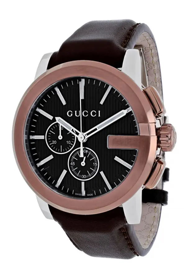 Gucci G-Chrono YA101202 — выразительный хронограф, сочетающий современную эстетику и благородные материалы. На запястье — круглый корпус 44 мм из нержавеющей стали, сапфировое стекло и контрастный безель из стали / розового золотого покрытия. Чёрный аналоговый циферблат и коричневый кожаный ремешок с классической пряжкой формируют уверенный, вне́временной спортивный образ.