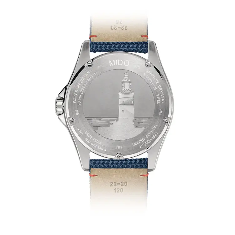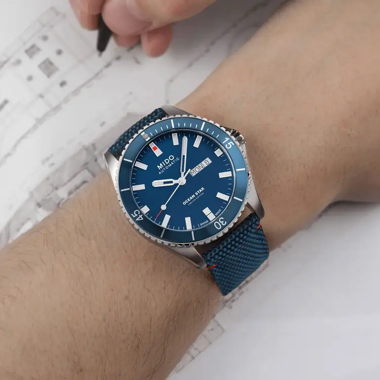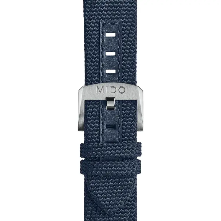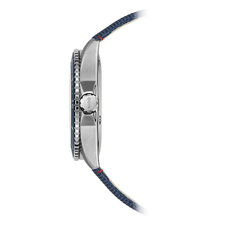 Модель оснащена элегантным синим текстильным ремешком с классической пряжкой, который гарантирует комфортное и безопасное крепление на запястье. Благодаря водонепроницаемости 20 ATM (200 метров) часы готовы к плаванию, сноркелингу и другим водным видам спорта.