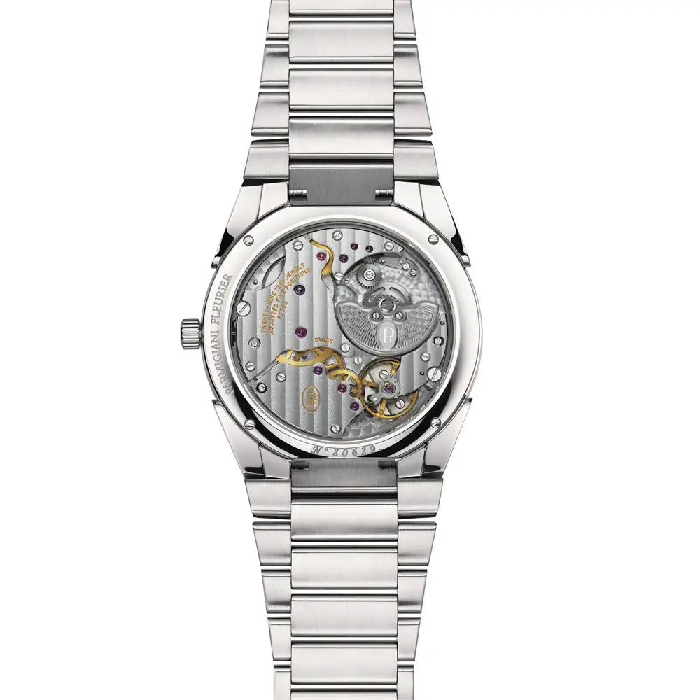 Внутри находится ультратонкий автоматический механизм PF703 с микроротором из платины 950 пробы, благодаря которому высота корпуса составляет всего 7,8 мм. Этот тщательно декорированный калибр обеспечивает запас хода 48 часов, а его красотой можно любоваться через сапфировое стекло. Отсутствие окошка даты подчеркивает идеальный визуальный баланс и четкость циферблата.