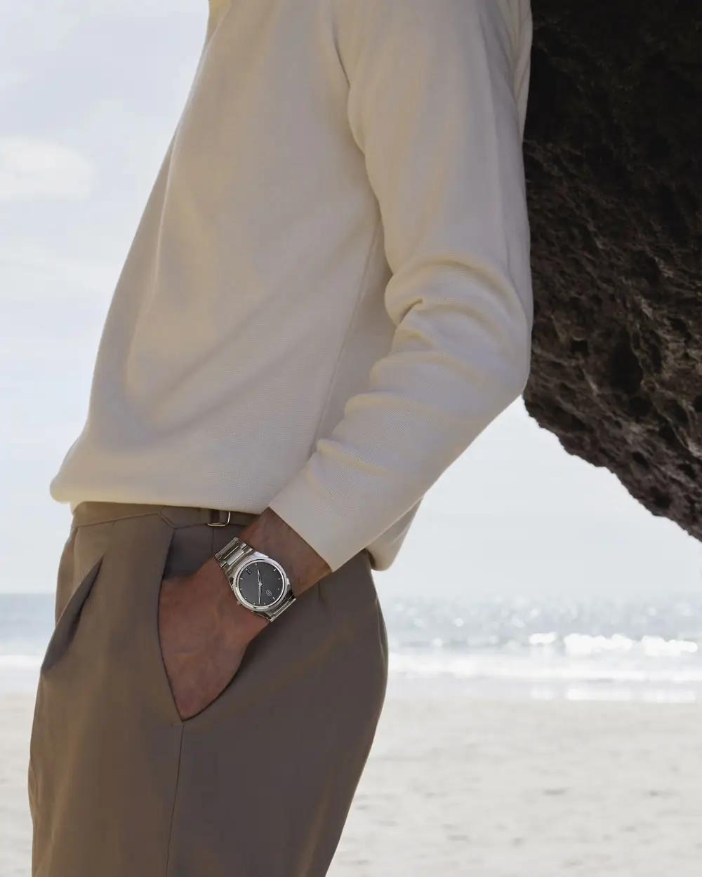 Часы оснащены интегрированным браслетом из нержавеющей стали, который плавно соединяется с корпусом и обеспечивает высокий комфорт при ношении. Благодаря водонепроницаемости 100 метров часы идеально подходят не только для торжественных случаев, но и для повседневного стиля. Эта модель понравится тем, кто стремится к минимализму, техническому мастерству и вневременному дизайну.