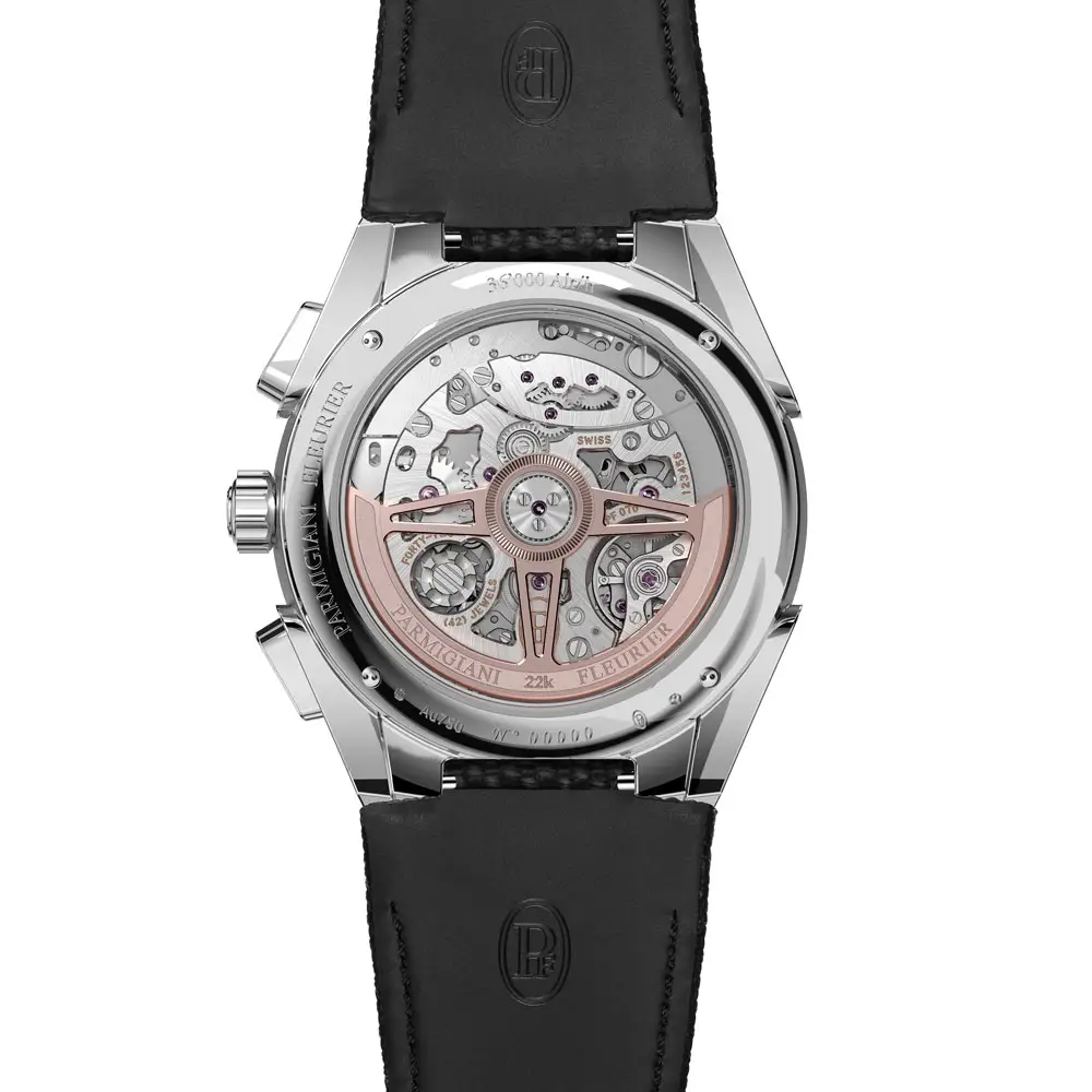 В часах установлен автоматический калибр PF070 собственной разработки с высокой частотой 5 Гц, сертификатом COSC и запасом хода 65 часов. Хронограф отличается точностью, надежностью, а также прекрасным оформлением, которым можно любоваться через прозрачный корпус из сапфирового стекла.