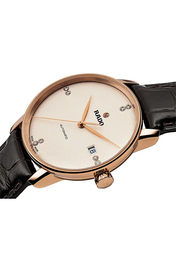 Традиционный вид мужских часов Coupole Classic R от Rado оживляют 8 крупных бриллиантов, отмечающих четверть часа. Бежевый цвет циферблата сочетается со стальным корпусом с отделкой из розового золота. Размер корпуса составляет 37,7 мм. Коричневый кожаный ремешок оснащен раскладывающейся застежкой. Водонепроницаемость достигает 50 м.