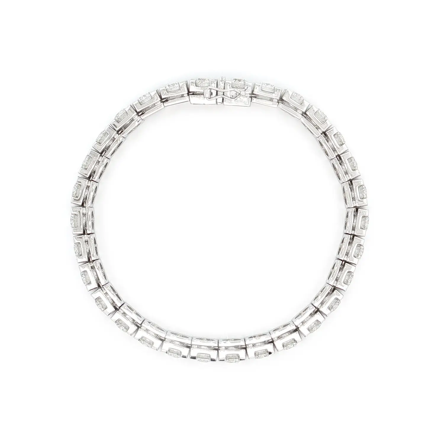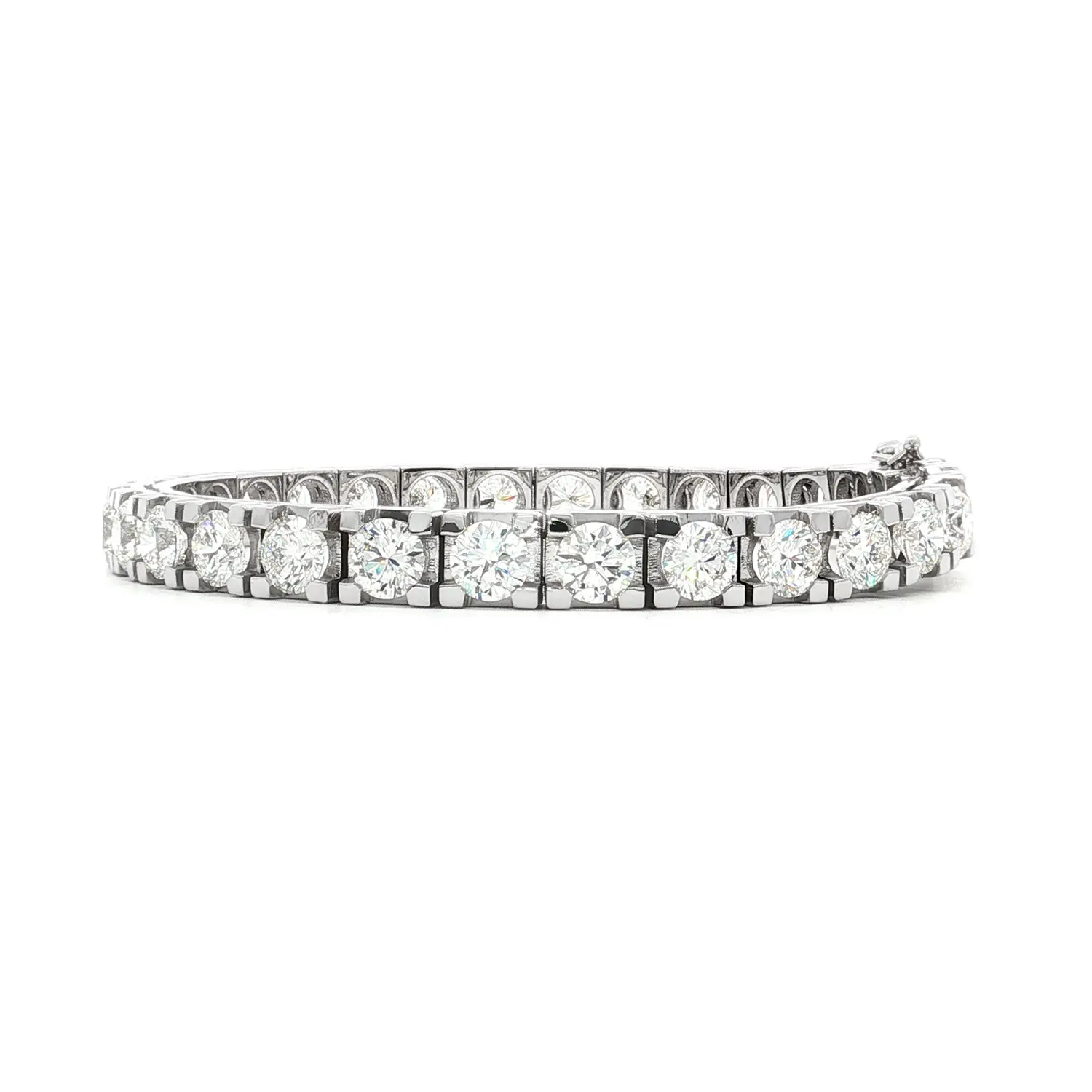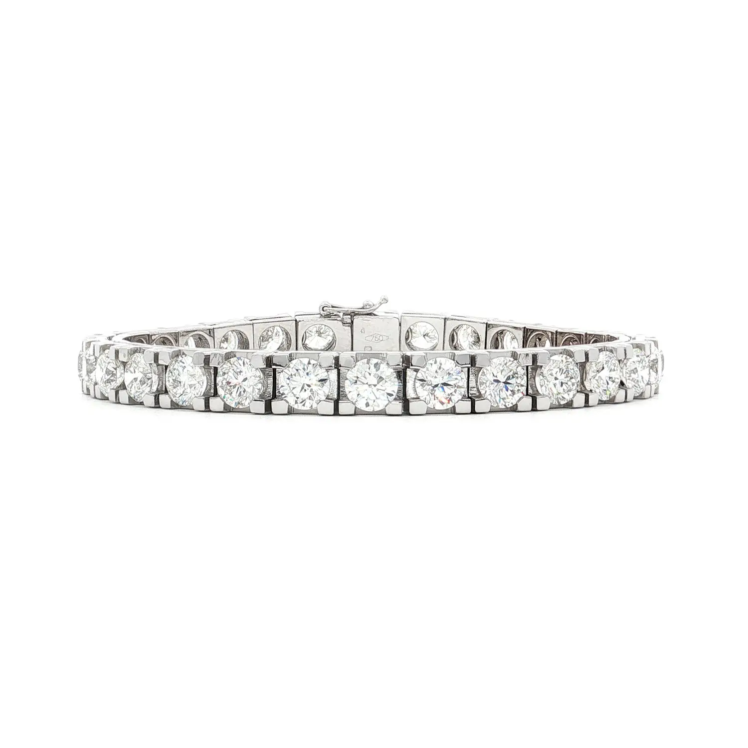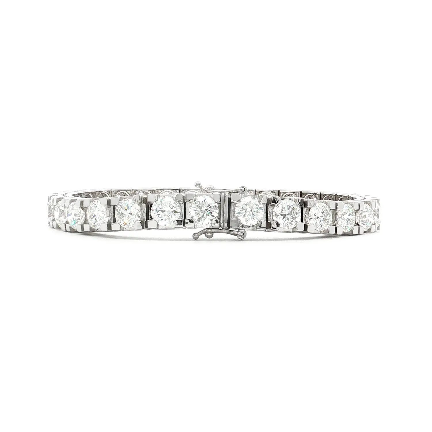 Tento luxusní tennis náramek z bílého zlata je osazen souborem brilantně broušených diamantů o celkové hmotnosti 15 ct, v výjimečné barvě F a čistotě VS1. Dokonale sladěné kameny jsou zasazeny v precizních čtyřkrapnových obrubách, které umožňují maximální průnik světla a zajišťují nepřehlédnutelný třpyt v každém úhlu. Jednotná velikost a proporce diamantů vytvářejí elegantní, dokonale plynulou linii typickou pro ikonický styl tennis náramků.