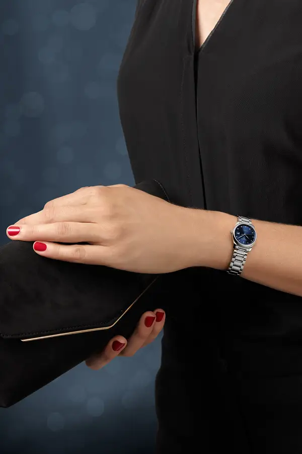 Na modrém sunray číselníku se vyjímají diamantové indexy, které dodávají hodinkám sofistikovaný a luxusní charakter. Stříbrné ručky kontrastují s výraznou barvou ciferníku a zajišťují perfektní čitelnost, přičemž celek působí mimořádně harmonicky.