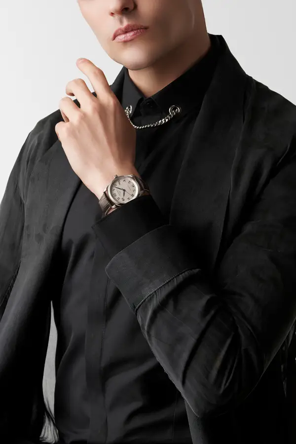 Na stříbrném „barleycorn“ číselníku vynikají arabské číslice a modřené ručky, které dodávají hodinkám sofistikovaný vzhled a výbornou čitelnost. Datumové okénko na pozici 3 hodin přidává praktický prvek, aniž by rušilo harmonii ciferníku.