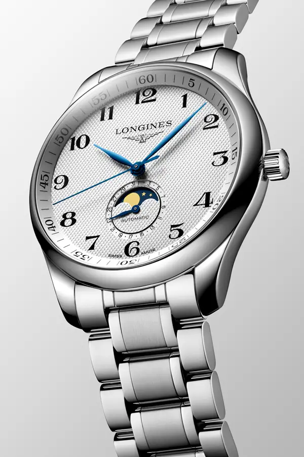Stříbrný číselník s jemným vzorem „barleycorn“ zdobí arabské číslice a modřené ručky, které dodávají hodinkám sofistikovaný vzhled. Na pozici 6 hodin se nachází subciferník kombinující ukazatel fází měsíce se zobrazením data, čímž model získává na praktičnosti i vizuální atraktivitě.