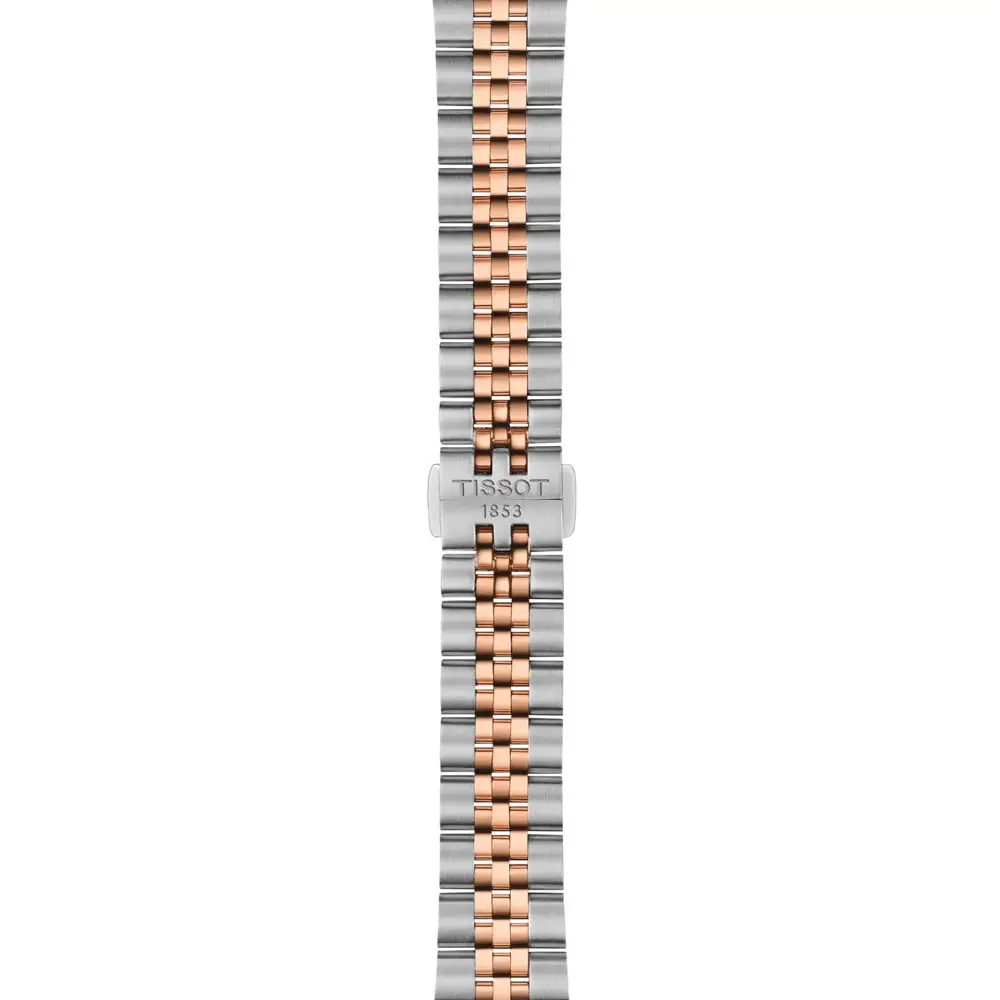 Dvoubarevný náramek z nerezové oceli a růžově zlatého PVD povlaku je vybaven motýlkovou sponou s tlačítky pro bezpečné a pohodlné zapínání. Systém rychlé výměny náramku umožňuje snadnou personalizaci hodinek podle vašeho stylu.