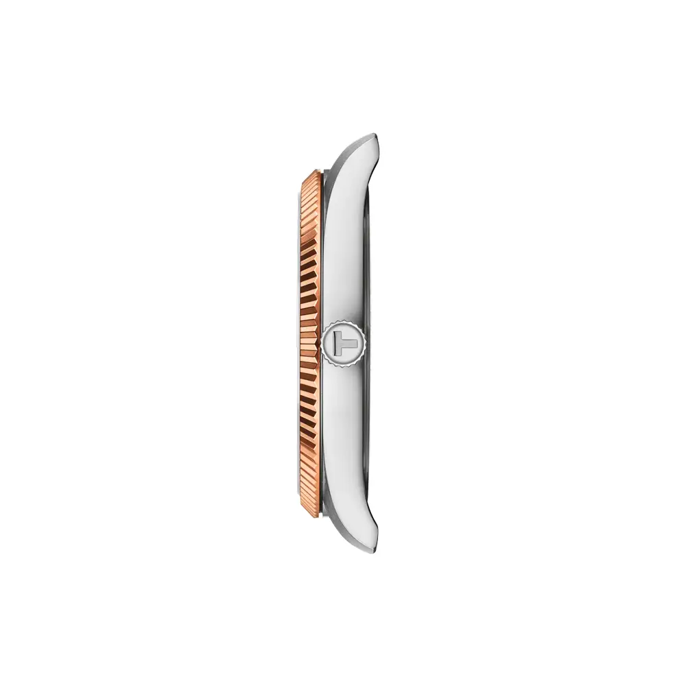 Dominantou je stříbrno-zlatý ciferník s jemným vzorem a římskými indexy, který podtrhuje elegantní charakter modelu. Ručky s Super-LumiNova® zajišťují dobrou čitelnost i za zhoršených světelných podmínek. Praktická datumovka na pozici 3 hodin doplňuje funkčnost. Hodinky jsou osazeny dvoubarevným ocelovým tahem (ocel + PVD zlacení) s motýlovou sponou.