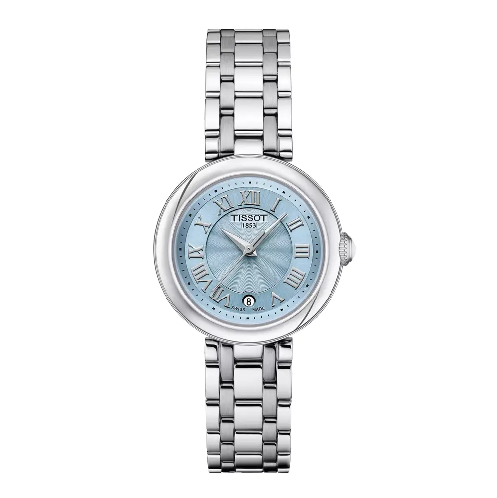 Tissot Bellissima Small Lady představuje esenci elegantních dámských hodinek, které spojují jemnost, klasický styl a moderní švýcarskou preciznost. Kompaktní 26mm pouzdro z nerezové oceli 316L doplňuje působivý modrý perleťový ciferník se subtilní texturou a římskými číslicemi, které dodávají modelu romantický a nadčasový výraz. Lehce kupolovité safírové sklíčko chrání ciferník a zajišťuje vysokou odolnost proti poškrábání.