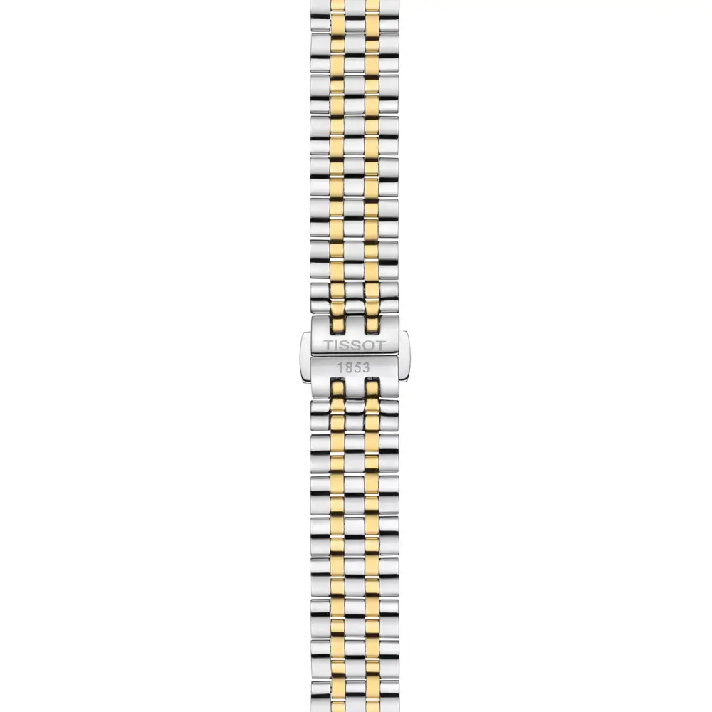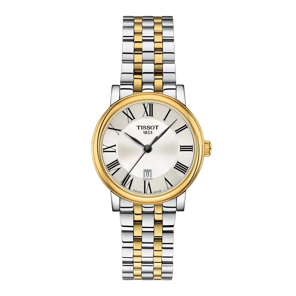 Model Tissot Carson Premium Lady T122.210.22.033.00 přináší elegantní spojení klasického stylu a jemného šperkového vzhledu. Dvoubarevné provedení (bicolor) kombinuje nerezovou ocel 316L se žlutou PVD úpravou, čímž vytváří výrazně ženský a nadčasový vzhled. Pouzdro o průměru 30 mm a velmi tenký profil kolem 6,7 mm dodávají hodinkám subtilní eleganci, zatímco stříbrný číselník zdobí římské číslice a datumovka na 6. pozici.