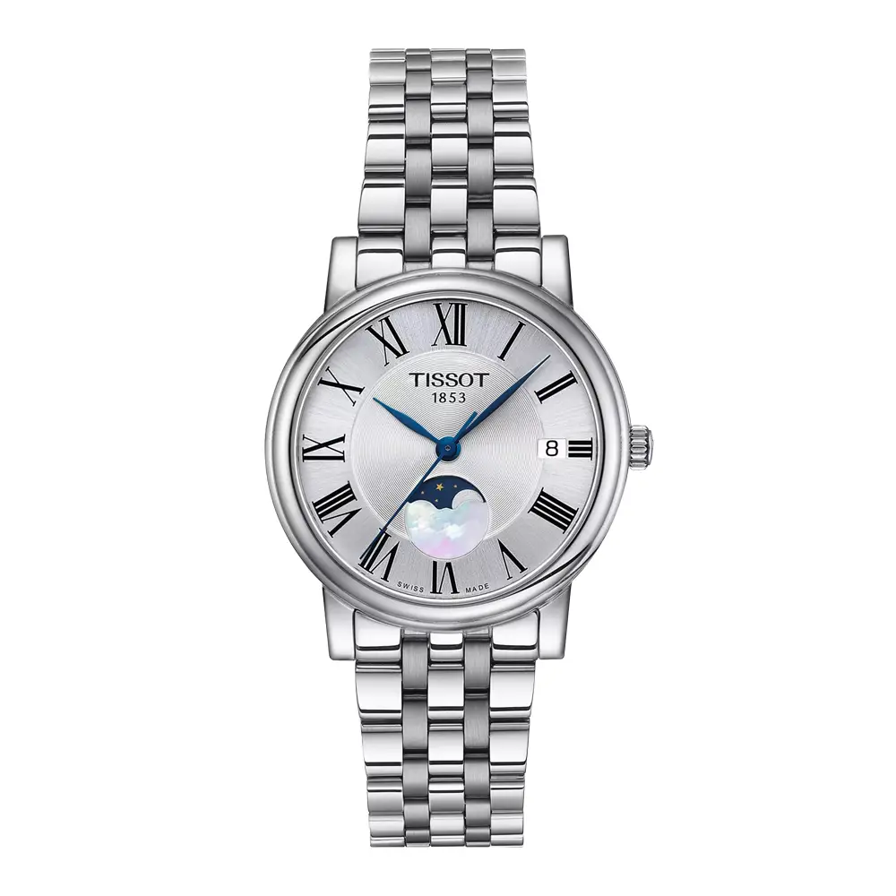 Tissot Carson Premium Lady Moonphase je elegantní dámský model, který spojuje jemnou estetiku, nadčasový styl a švýcarskou preciznost. Pouzdro o průměru 32 mm z ušlechtilé oceli 316L doplňuje vyvážený stříbrný ciferník s římskými číslicemi a modřenými ručkami, které vytvářejí harmonický a klasický vzhled vhodný pro každý den i slavnostní chvíle. Celek doprovází ocelový náramek, jenž podtrhuje elegantní charakter hodinek.