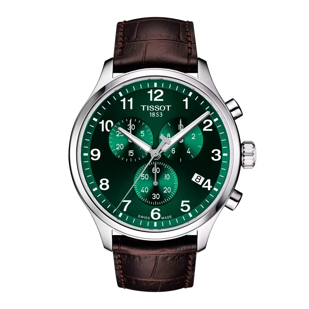 Tissot Chrono XL Classic je výrazný pánský model, který spojuje sportovní eleganci s praktickými funkcemi. Hodinky zaujmou velkým 45mm pouzdrem z nerezové oceli, zeleným ciferníkem s efektem slunečního brusu a hnědým koženým řemínkem s klasickou trnovou sponou. Luminiscenční ručky a indexy Super-LumiNova® zajišťují skvělou čitelnost i za šera.