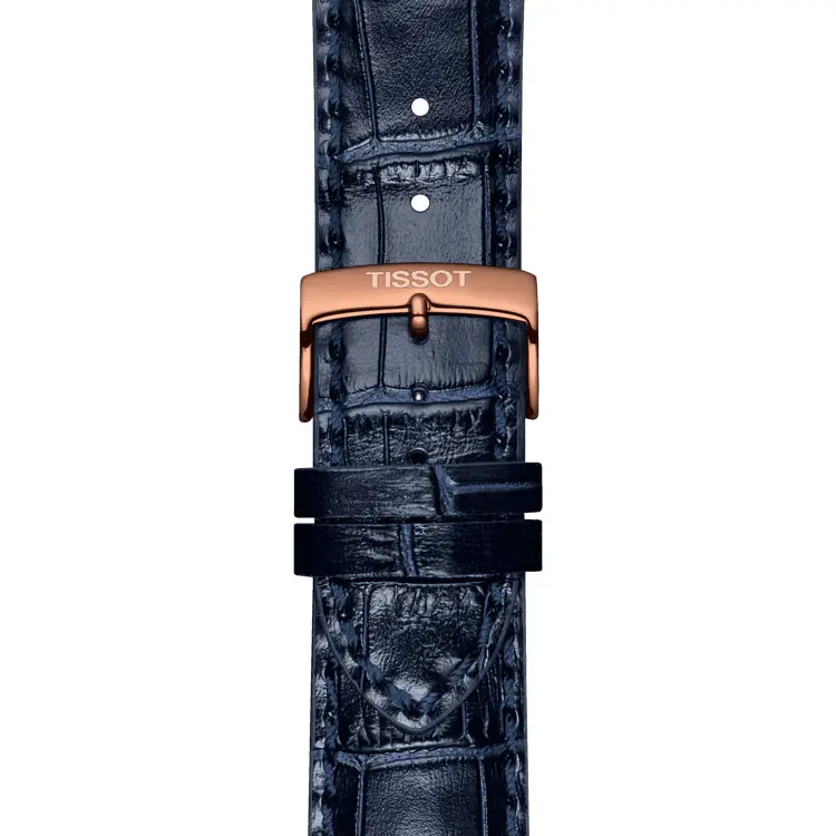 Modrý kožený řemínek s aligátorovým vzorem je zakončen klasickou trnovou sponou s logem Tissot, která zajišťuje pohodlné a bezpečné nošení.