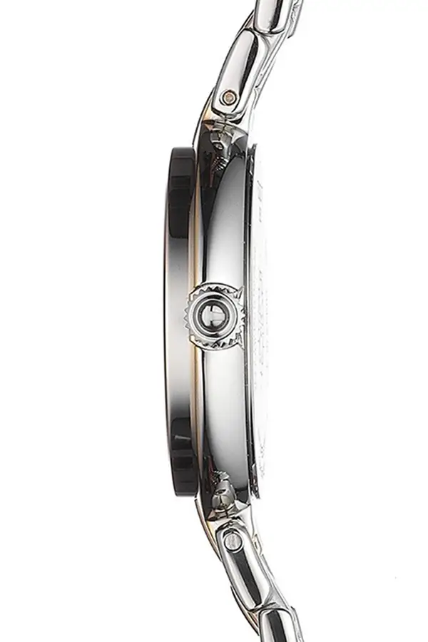 Klasické hodinky s netradičním barevným zpracováním budou ozdobou každého dámského zápěstí. Kombinace stříbrné oceli s růžovým zlacením je trendem posledních let. Analogový číselník ve zlatém provedení je uložen na perleťovém podkladu. Umně zakomponovaná korunka nebude hrozbou ani pro oblečení z jemného materiálu. Ciferník chrání nejodolnější safírové sklíčko.