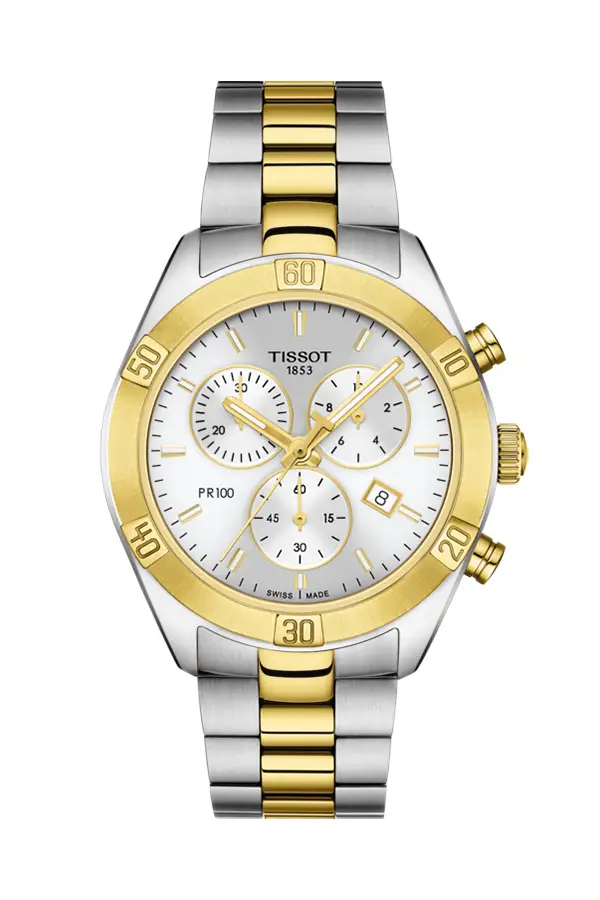 Tissot PR 100 Sport Chic T101.910.22.111.00 spojuje eleganci a sportovní styl v jednom dokonale vyváženém modelu. Kulaté ocelové pouzdro o průměru 36 mm je osazeno lunetou z oceli se žlutým zlacením a chráněno odolným safírovým sklíčkem, které brání poškrábání. Luxusní perleťový ciferník doplňuje praktická datumovka umístěná na třetí hodině.