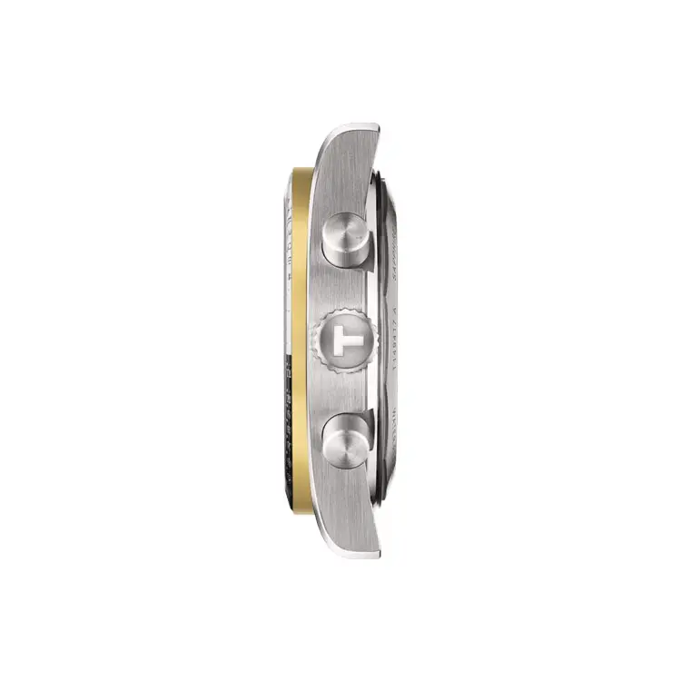 Tissot PR516 Chronograph je sportovně-elegantní model, který v sobě spojuje odkaz ikonických závodních hodinek 70. let s moderním švýcarským hodinářstvím. Kulaté ocelové pouzdro o průměru 40 mm doplňuje stylová ocelová luneta se žlutým zlacením, chráněná odolným safírovým sklíčkem, které zajišťuje perfektní čitelnost a vysokou odolnost proti poškrábání.