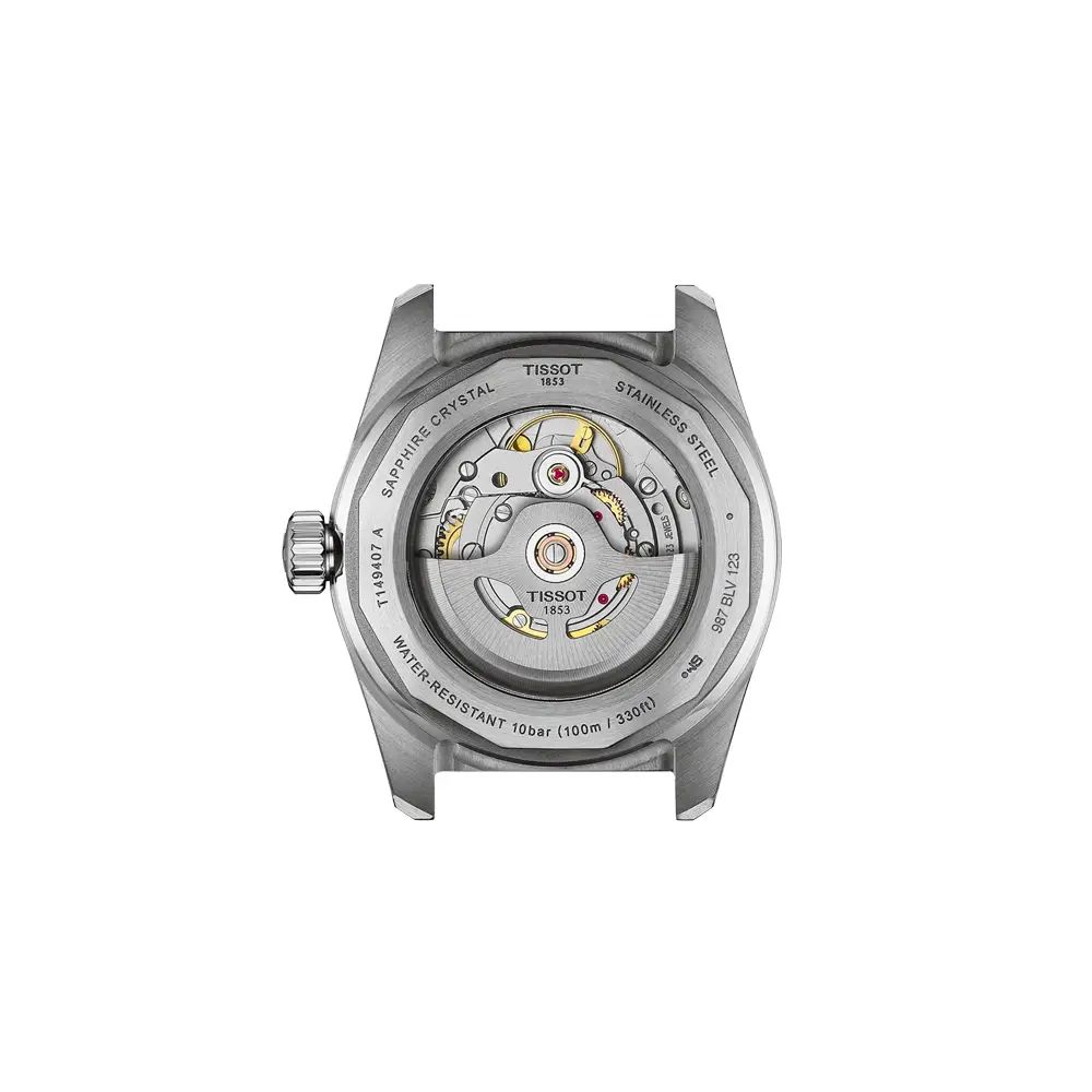 Strojek tvoří automatický kalibr ETA Powermatic 80 (C07.111) s výjimečnou rezervou chodu až 80 hodin, což znamená pohodlné nošení i při nepravidelném nasazování. Díky voděodolnosti 100 m (10 ATM) zvládnou i kontakt s vodou — déšť, sprchu či mytí rukou, aniž by utrpěla odolnost. Transparentní dýnko umožňuje nahlédnout na precizní mechaniku uvnitř a zdůrazňuje technickou kvalitu modelu.