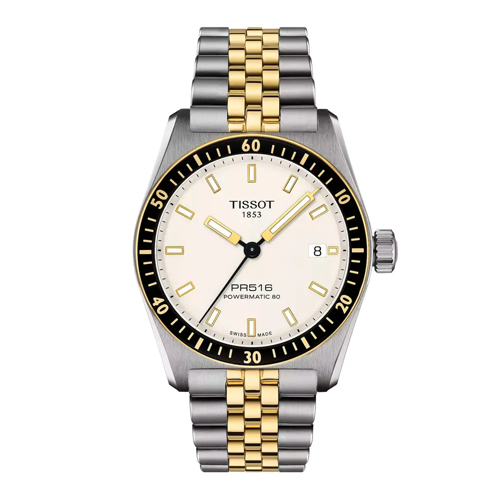 Dvoubarevný náramek z nerezové oceli se žlutým PVD zlacením doplňuje sportovně-elegantní charakter hodinek a nabízí maximální komfort při nošení. S voděodolností do 100 m (10 ATM) se hodinky hodí jak do společnosti, tak pro každodenní nošení. Tissot PR516 Powermatic 80 představují dokonalé spojení dědictví, stylu a precizního švýcarského inženýrství.