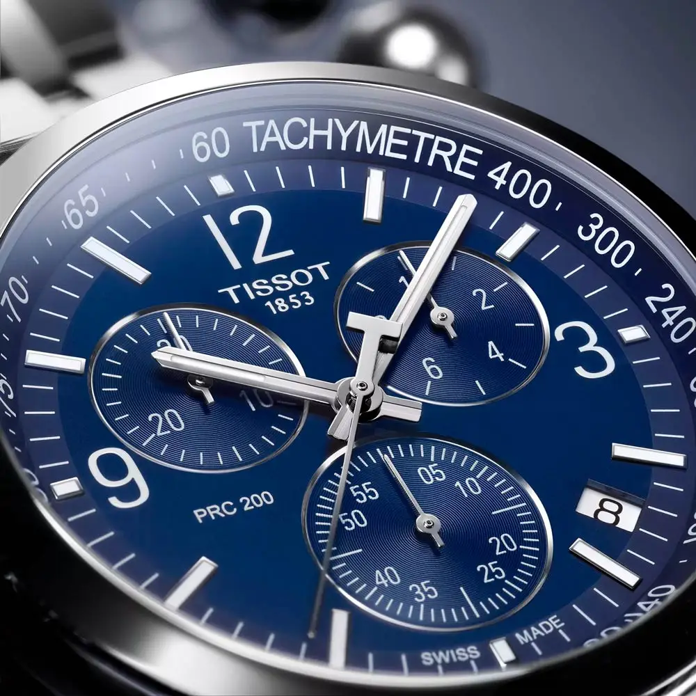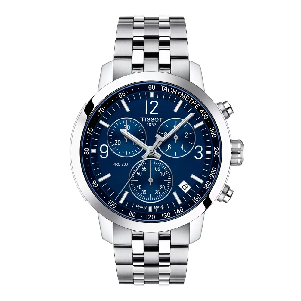 Tissot PRC 200 Chronograph T114.417.11.047.00 spojuje sportovní eleganci, výkon a švýcarskou preciznost. Jeho ocelové pouzdro o průměru 43 mm doplňuje modrý číselník s třemi subciferníky chronografu, luminiscenčními ručkami a indexy, které zaručují skvělou čitelnost i za zhoršených světelných podmínek.