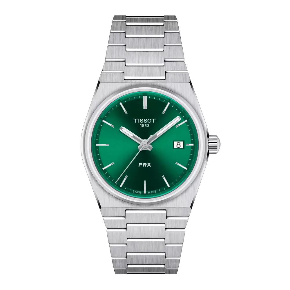 Tissot PRX 35mm, model T137.210.11.081.00, jsou elegantní hodinky, které kombinují retro styl s moderními technologiemi. Tento model se vyznačuje průměrem pouzdra 35 mm, které je vyrobeno z nerezové oceli, a zeleným ciferníkem se slunečním vzorem. Hodinky mají integrovaný náramek z nerezové oceli s rychloupínacím systémem, což usnadňuje výměnu řemínků.