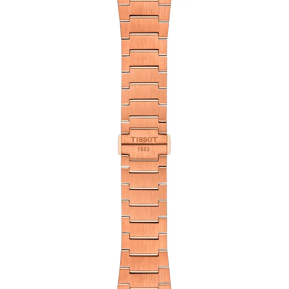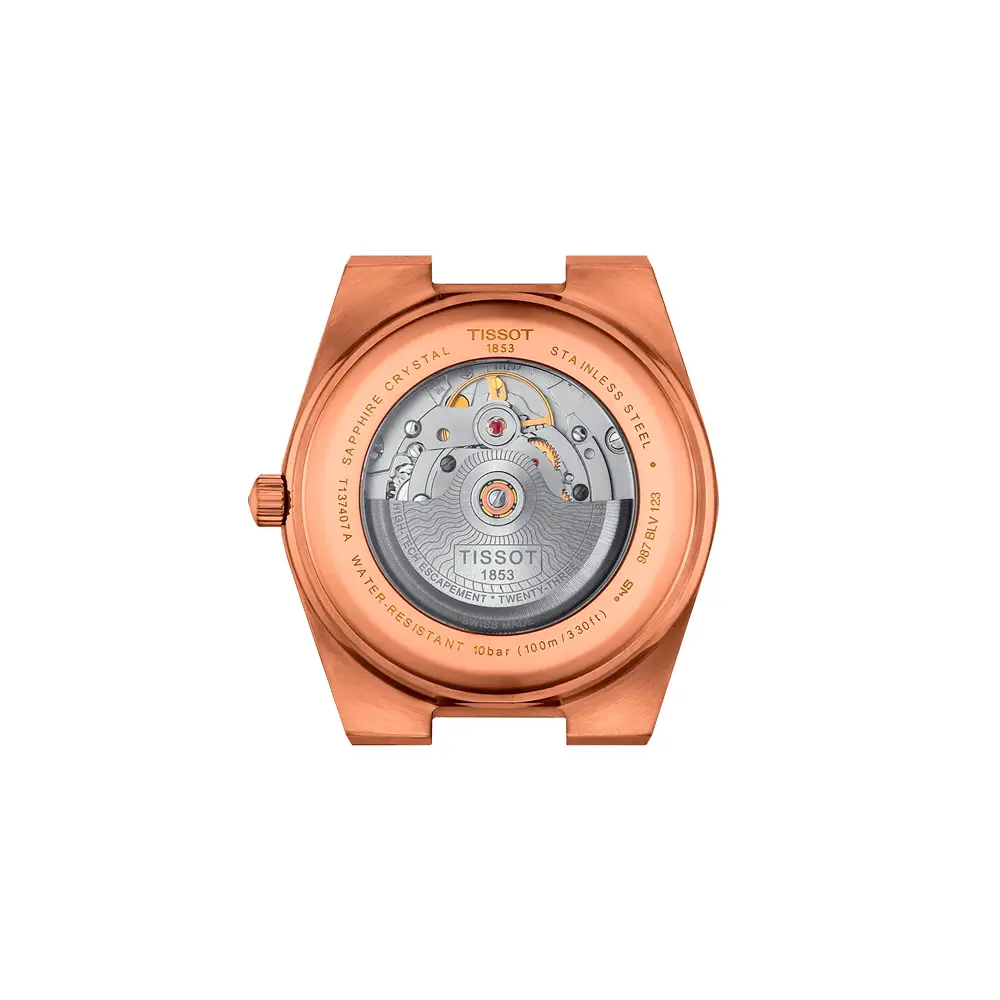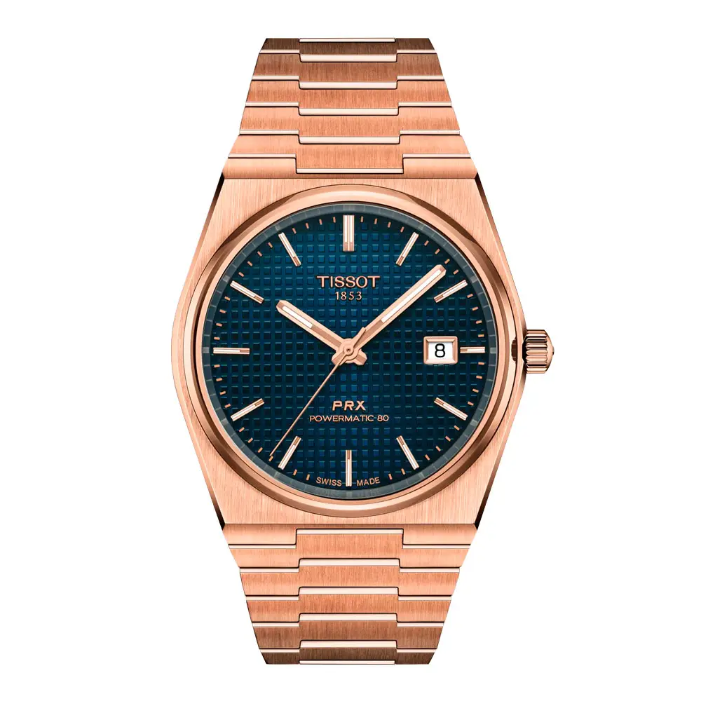 Model Tissot PRX Powermatic 80 T137.407.33.041.00 představuje elegantní kombinaci sportovního designu 70. let a současné precizní technologie. Jeho 40mm pouzdro z nerezové oceli s povrchovou úpravou PVD v odstínu růžového zlata doplňuje modrý číselník s jemnou strukturou a luminiscenčními indexy, které zajišťují výbornou čitelnost i za šera.