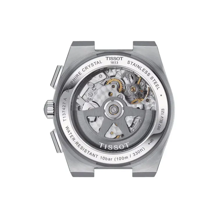 Uvnitř pracuje automatický strojek Valjoux A05.H31 s rezervou chodu 60 hodin, který nabízí přesné funkce chronografu pro měření sekund, minut i hodin. Průhledné dýnko umožňuje obdivovat detailní dekorace mechanizmu a podtrhuje technickou dokonalost značky Tissot. Model je vodotěsný do 100 metrů (10 barů), takže se hodí jak pro běžné nošení, tak pro sportovní využití.