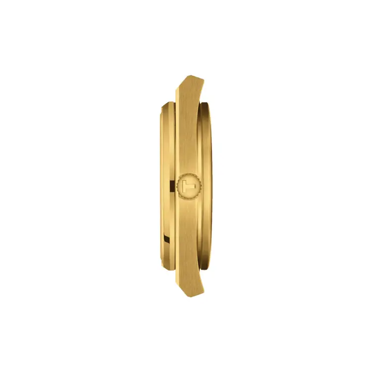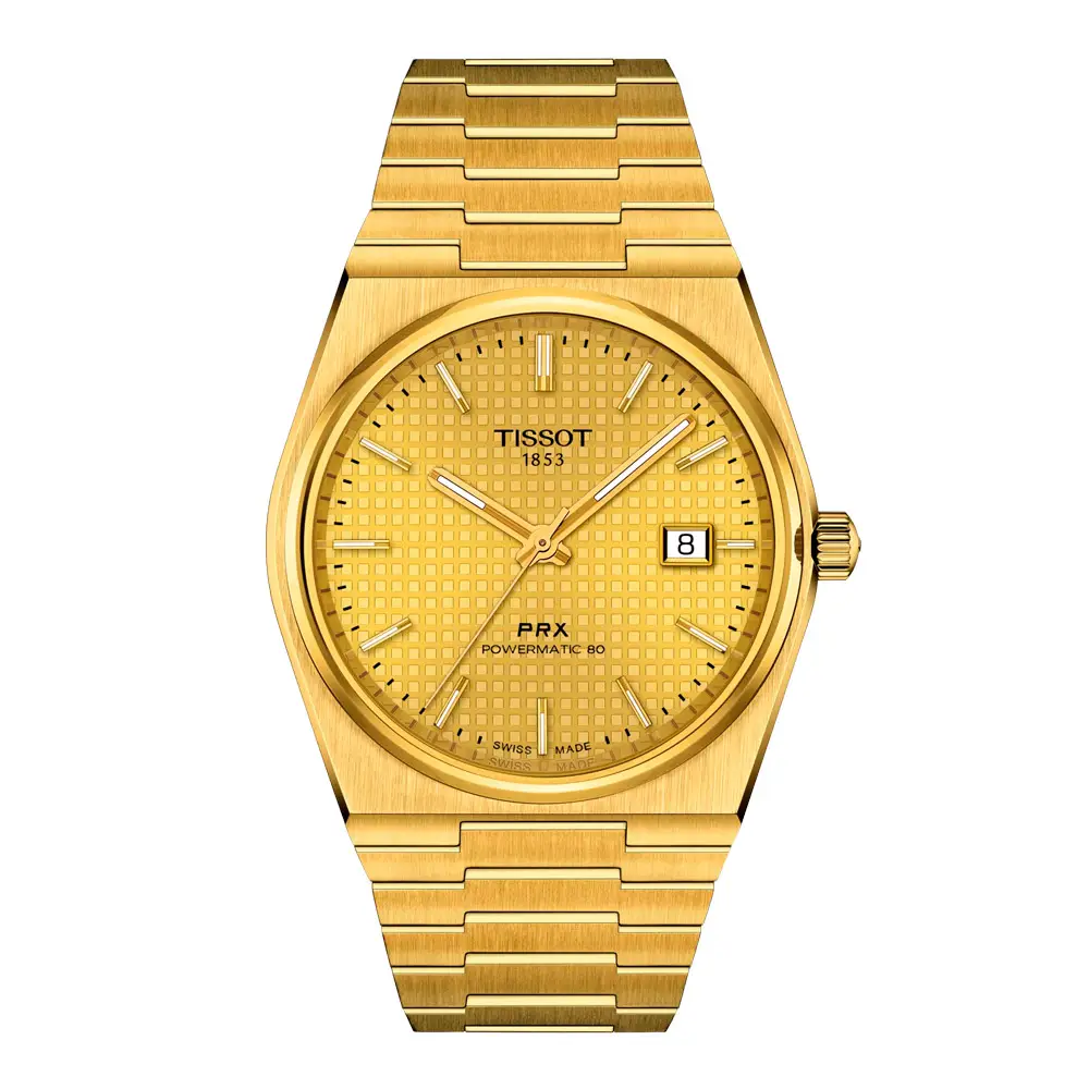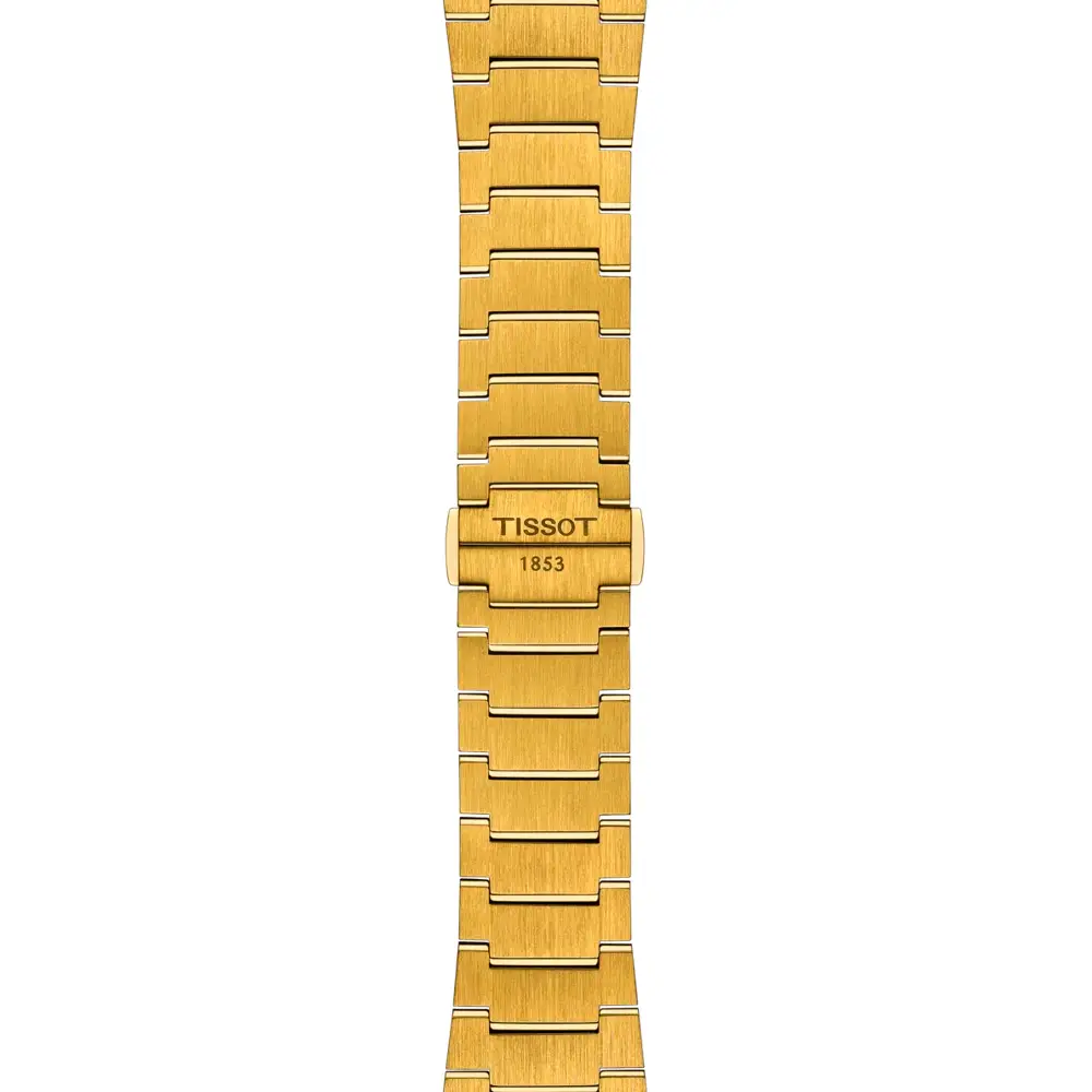 Tissot PRX Powermatic 80 vyniká svým luxusním retro-moderním stylem a technickou precizností. Hodinky mají kulaté ocelové pouzdro o průměru 40 mm s elegantním žlutým zlacením, které působí výrazně a sofistikovaně. Otočná luneta z oceli se žlutým zlacením harmonicky navazuje na zlatý ocelový náramek s překlápěcí sponou, což podtrhuje exkluzivní vzhled celého modelu.